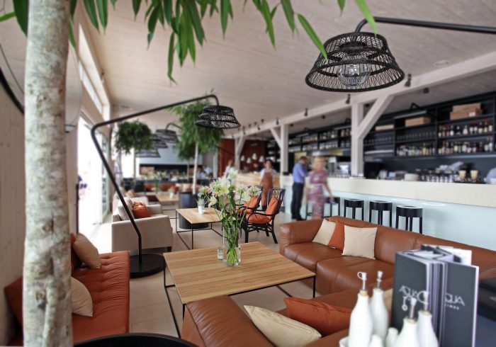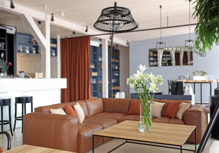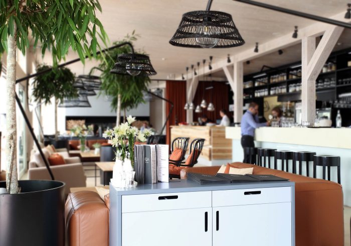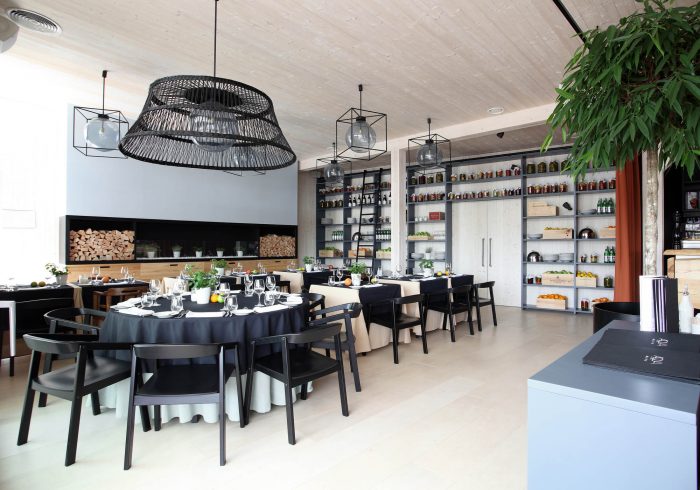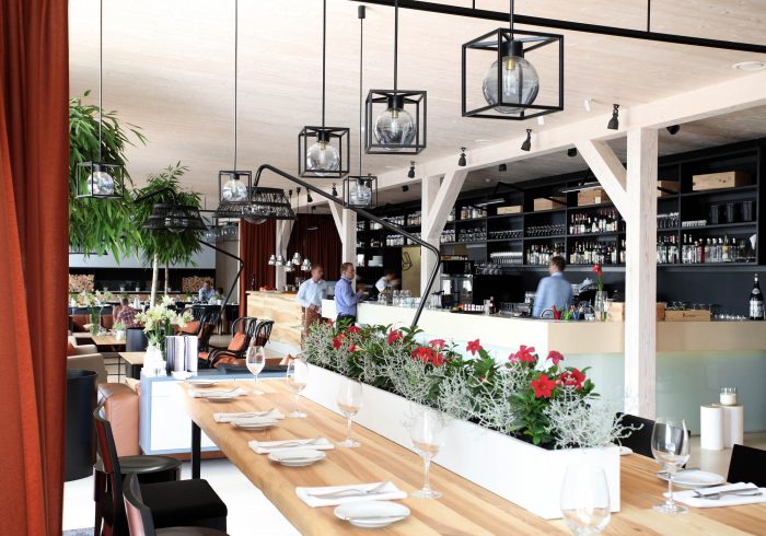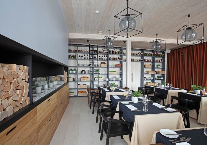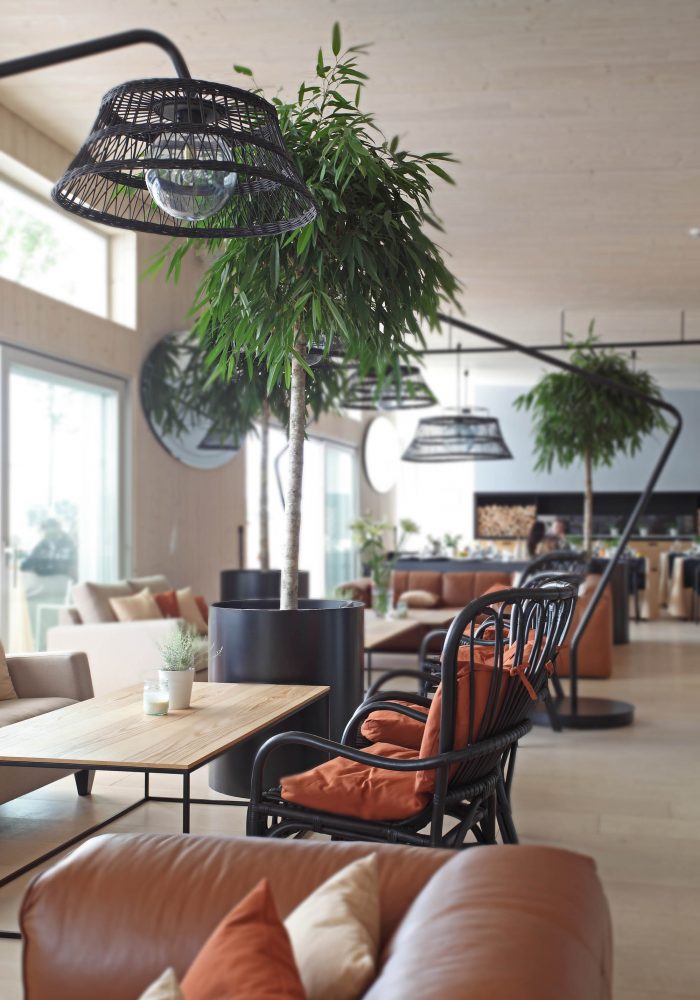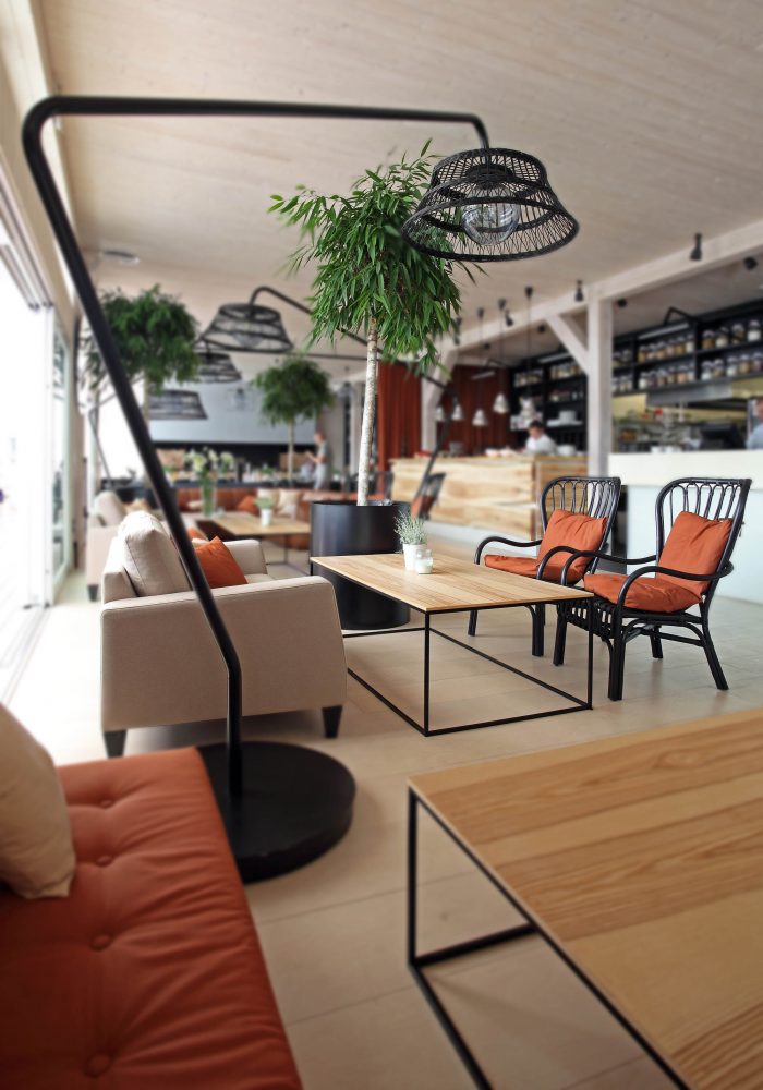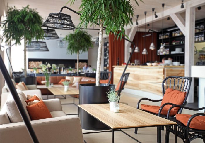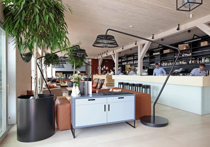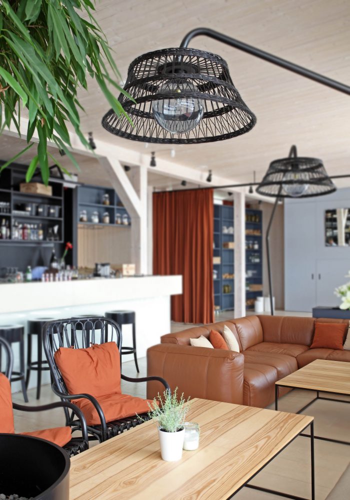 There are 3 main zones – bar, lounge and restaurant. The light and simple interior finishes serve as a background for large scale design elements – trees in metal pots, wickerwork lamps, tall solid wood tables and benches with metal legs, huge leather corner sofas, DJ furniture, long bar counter and shelves behind it. A large fireplace, dividing curtains and restaurant accessories in the shelves ensure warm and cosy atmosphere while details like the mirrors with brass frames, metal and glass lamps, cast iron radiators, shelf ladders, and a glass bar emanate style and elegance. Most of the furniture and design elements are made in Latvia.
