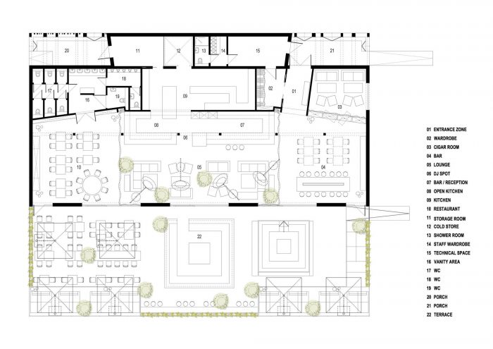 这里有3个主要区域--酒吧、休息室和餐厅。浅色和简单的内部装饰作为大型设计元素的背景--金属盆中的树木、柳条灯、高大的实木桌子和带金属腿的长凳、巨大的皮质转角沙发、DJ家具、长长的酒吧柜台和它后面的架子。大壁炉、隔断窗帘和架子上的餐厅配件确保了温暖舒适的氛围,而细节方面,如黄铜框架的镜子、金属和玻璃灯、铸铁散热器、架子上的梯子和玻璃吧台都散发着时尚和优雅。大部分的家具和设计元素都是在拉脱维亚制造的。