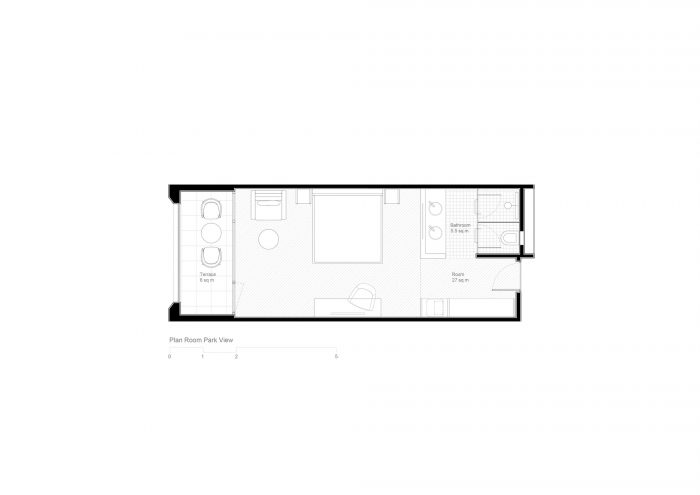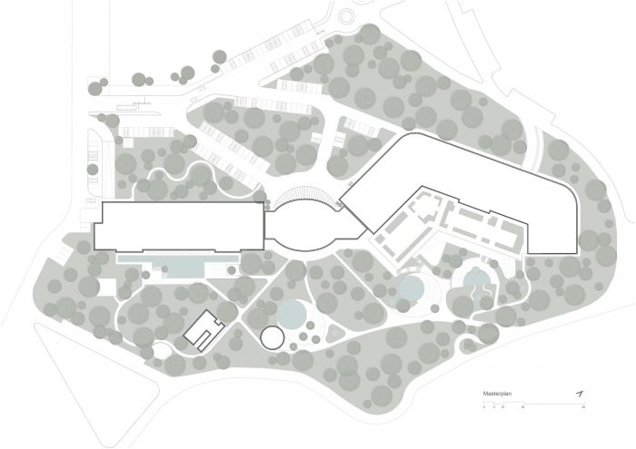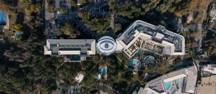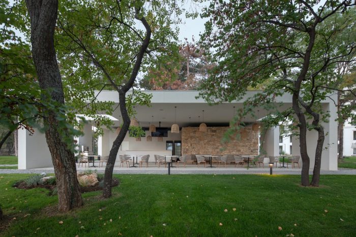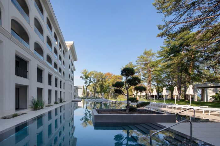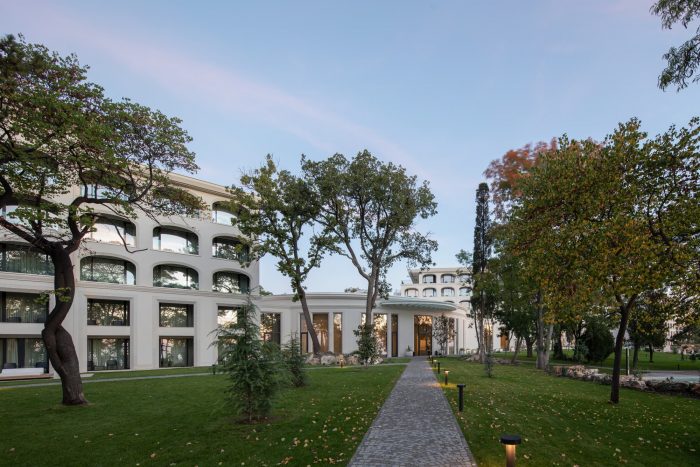 The resort is well known for its rich and dense greenery areas, some species of which were brought in from France at the time of its establishment in 1908. Inside the plot area of the hotel, there are dozens of black pine trees that are taken into account while planning the masterplan. Initially, there were existing old hotels and restaurants that were later demolished, and the building footprint is within the same margins, keeping almost all existing trees.