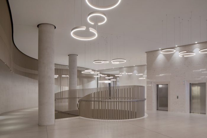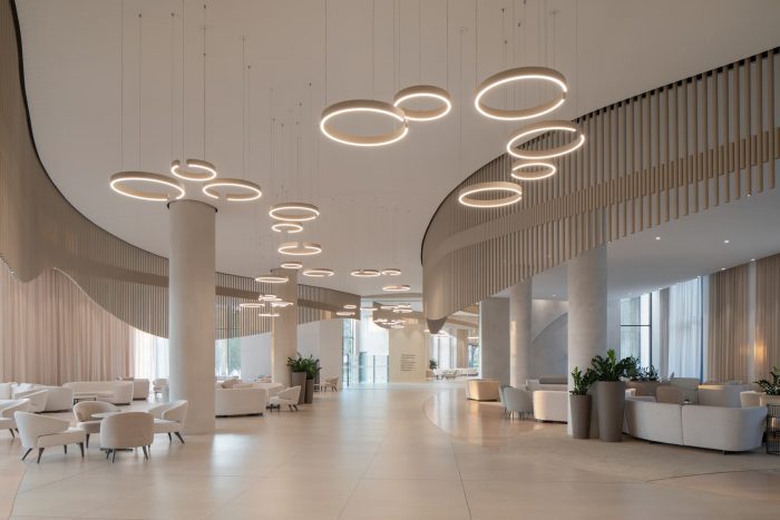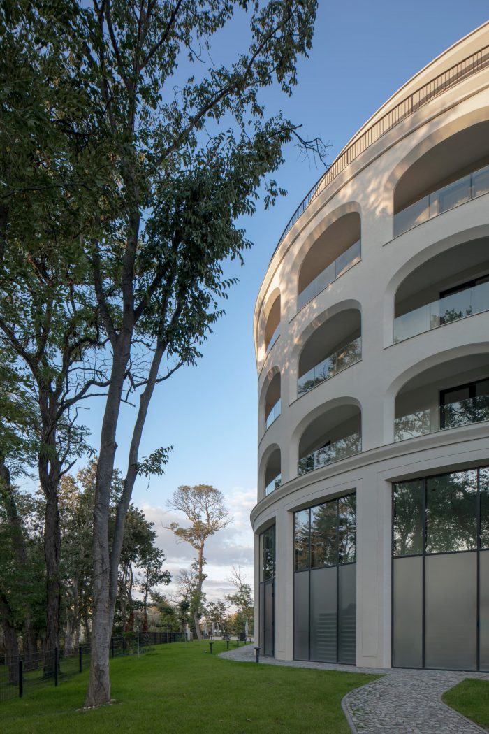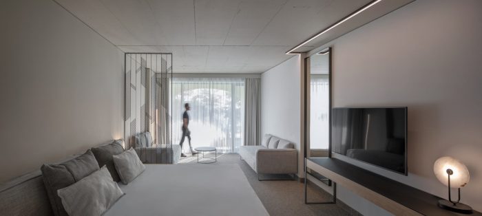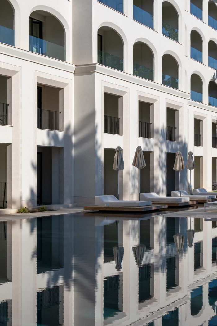 Inspired by the natural context itself, the design of the hotel aimed to serve as a neutral background to the mesmerizing pine trees. Soft sand tones are used all over the volume in order to achieve a single unified look from plaster and limestone. The minimal look with classical elements is accompanied by the design’s most eye-catching feature, the flattened arch. Repeated all over the façades, it is a reference to the natural sea arches that surround the water underneath, in the same way as every arch in the hotel surrounds the maximized glazing of the room behind.