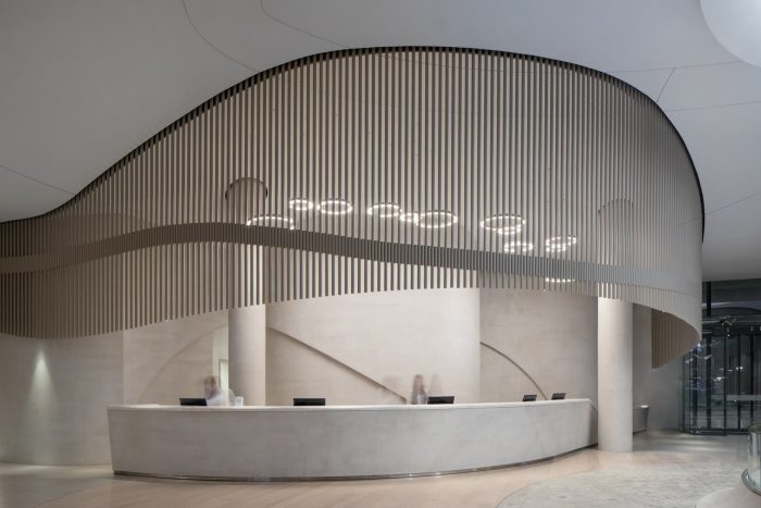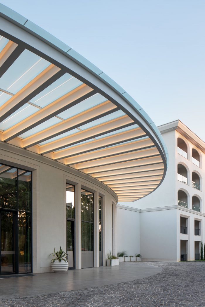 受自然环境本身的启发,酒店的设计旨在作为迷人的松树的一个中性背景。柔和的沙子色调被用于整个体量,以实现石膏和石灰石的单一统一的外观。带有古典元素的最小外观伴随着设计中最引人注目的特征--扁平的拱门。它在整个外墙重复出现,是对自然界中环绕水面的拱门的一种参考,就像酒店的每一个拱门都环绕着后面房间的最大玻璃一样。