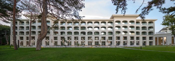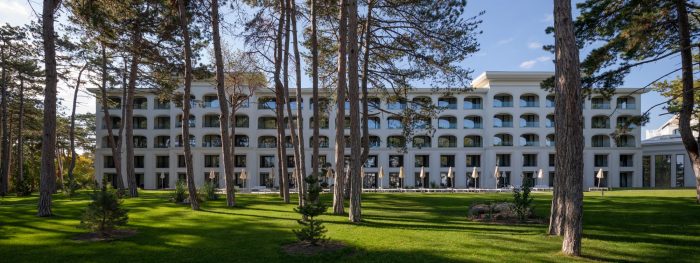 该度假村以其丰富和密集的绿化区而闻名,其中一些物种是在1908年建立时从法国引进的。在酒店的地块范围内,有几十棵黑松树,在规划总体规划时就考虑到了。最初,这里有现有的老酒店和餐馆,后来被拆除了,建筑的占地面积也在相同的范围内,几乎保留了所有现有的树木。