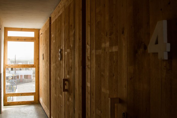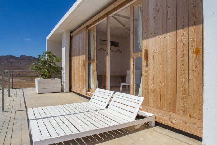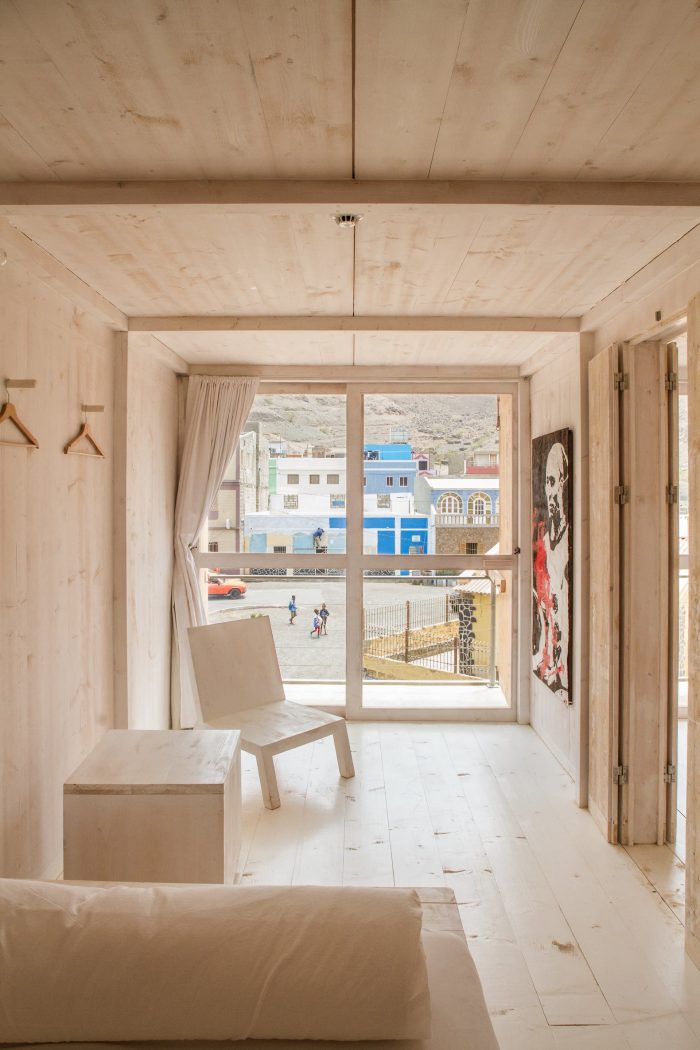 The structure is composed by 13 wooden container sized rooms, set in a beton brut structure and painted with lime putty.