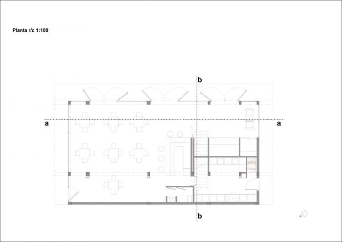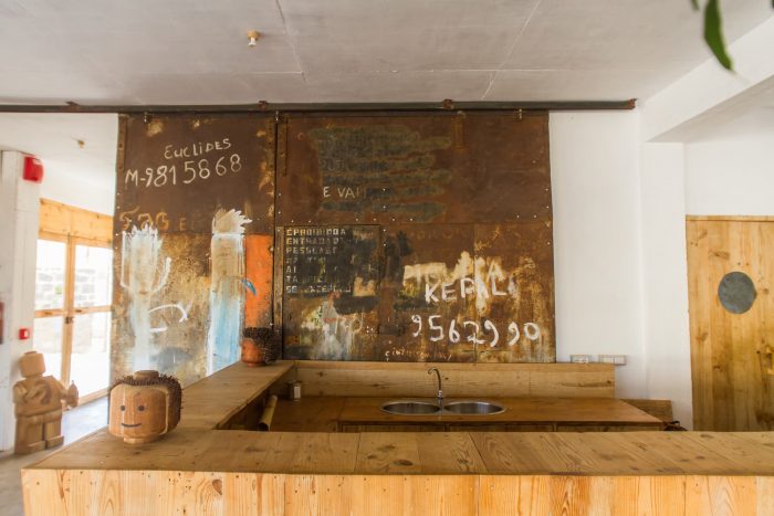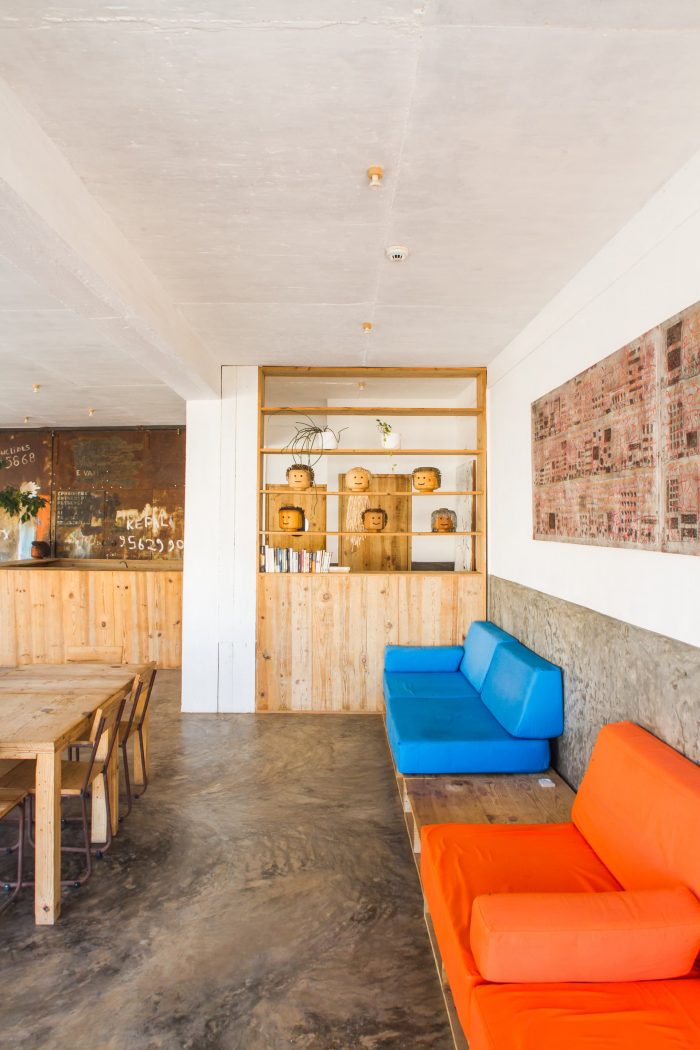 In the ground floor there is the reception, the kitchen and the restaurant lounge. A Concrete floor, and simple furniture made with recycled wood (used for the concrete) are the main decoration of those open spaces.