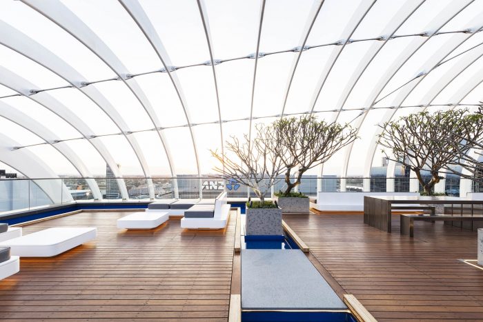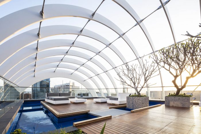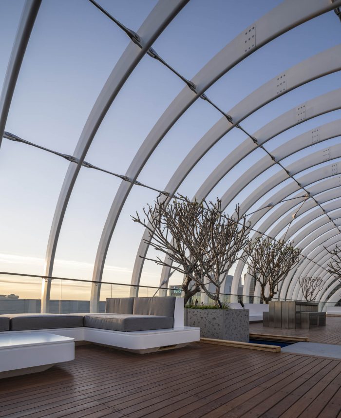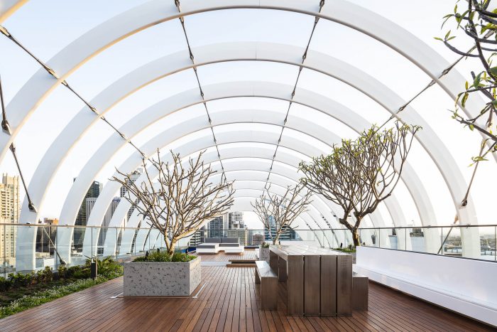 The rooftop opens up a new dialogue with what is possible in our future cities activating not only the ground plane but also the sky-plane. When you come up to the Arc rooftop, you can see the Sydney Harbour as a backdrop to the city view. The curved roof arches connect you with the organic and undulating lines of Sydney Harbour and its best natural assets.