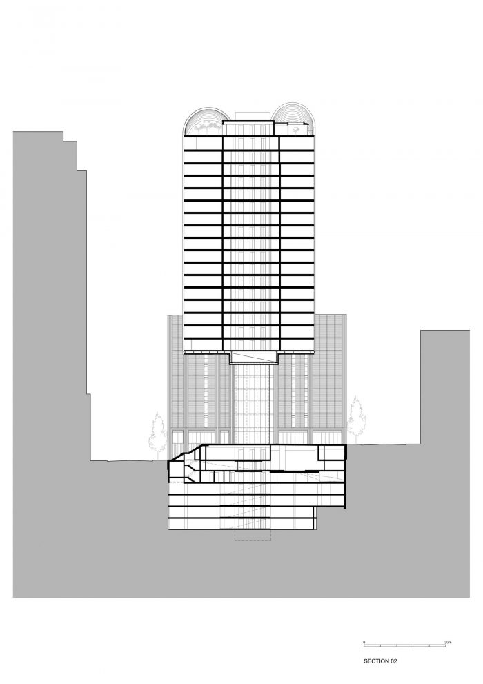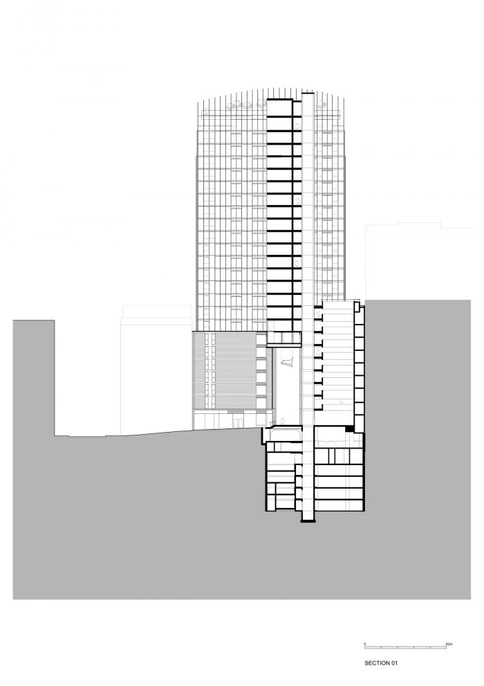 The building combines old and new, a handcrafted brick podium, and an organic roof feature designed to add more character to the future of Sydney. The 26-story tower is a true mix of accommodation, containing 135 apartments, 86 ‘Skye Suites’ boutique hotel rooms, 8 retail and F&B outlets. Included in the design is a retail precinct below an 8-story high public through site link, reactivating the historic Skittle Lane.