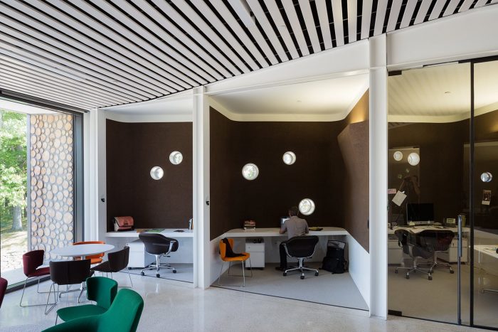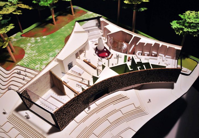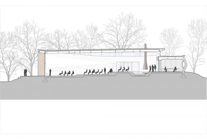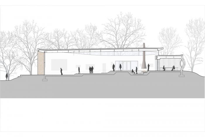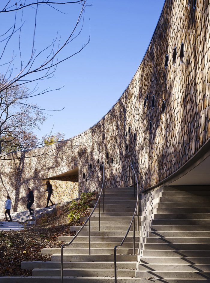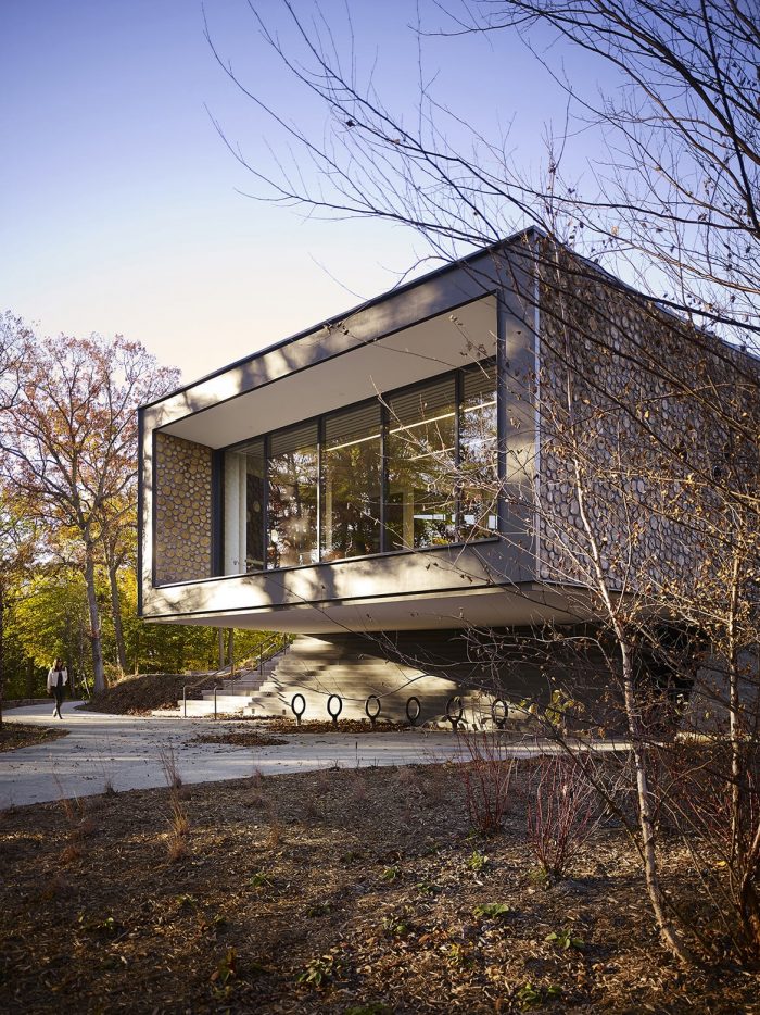 The Center’s architecture supports this work in several important ways. Inside, the building’s visually open and day-lit interior is designed to encourage “convening” in configurations that begin to break down psychological and cultural barriers between people and help facilitate understanding. The presence of a living room, hearth, and kitchen for sharing food at the center of the building creates the potential for frequent informal meetings and casual or chance encounters.
