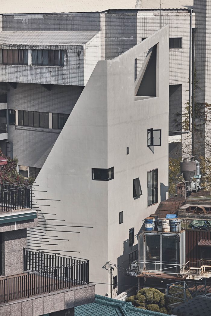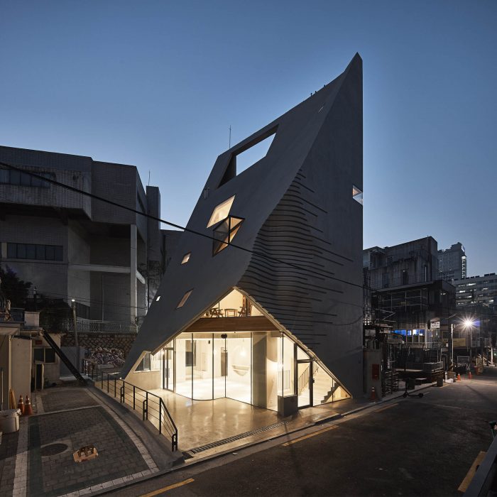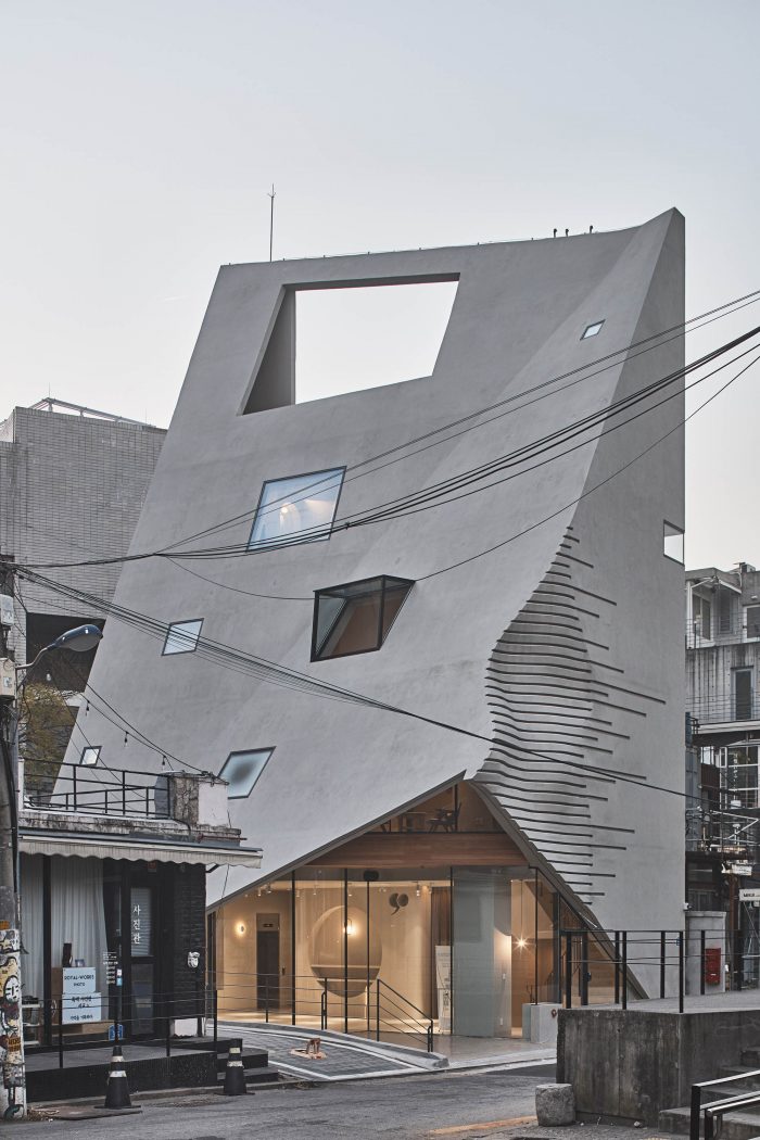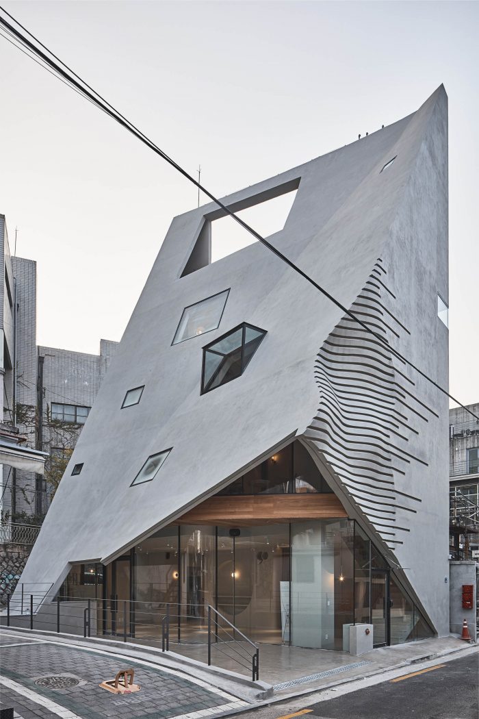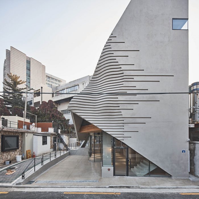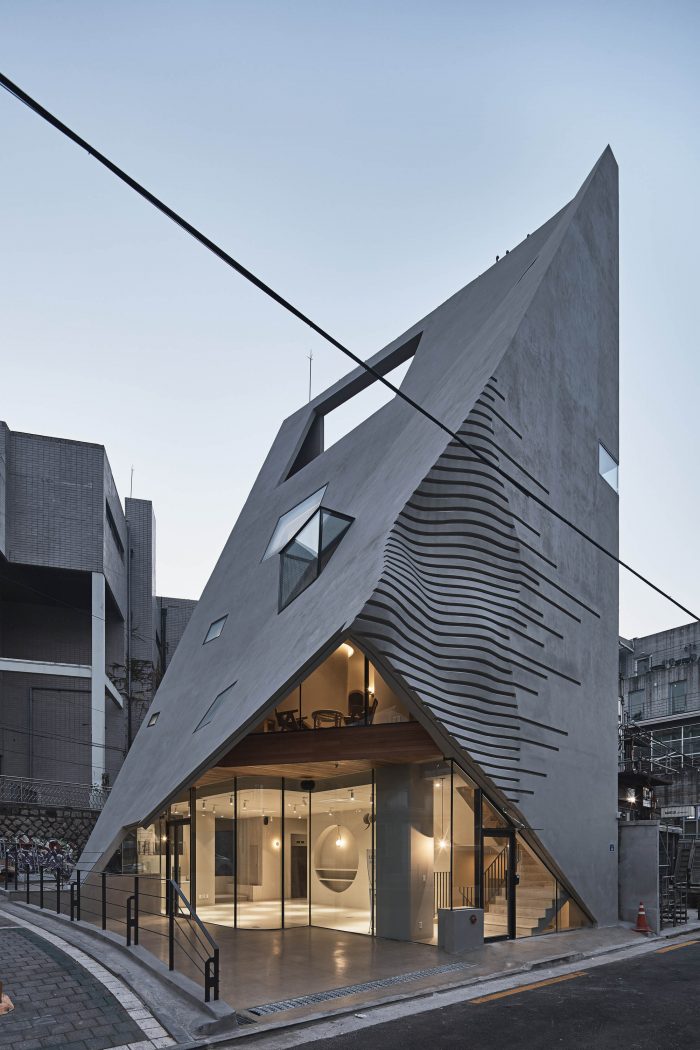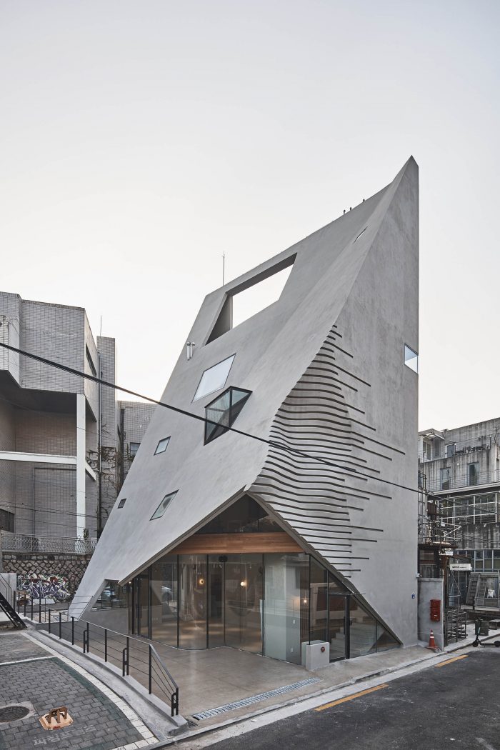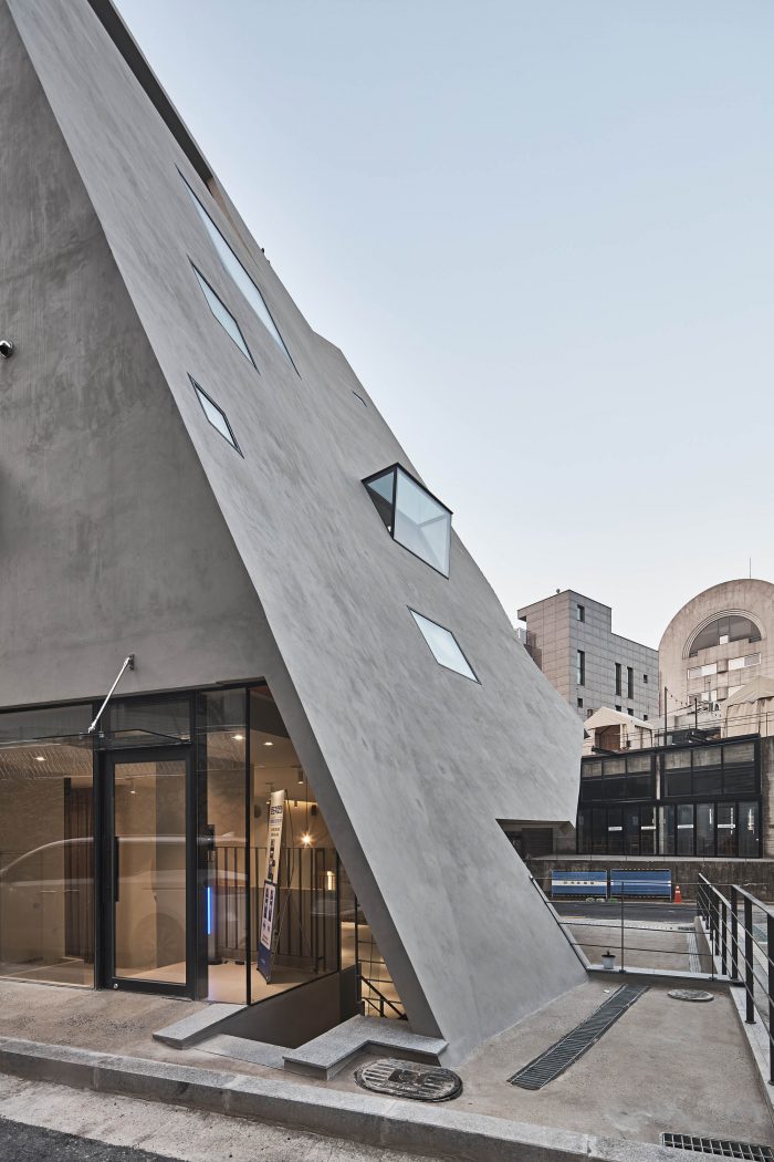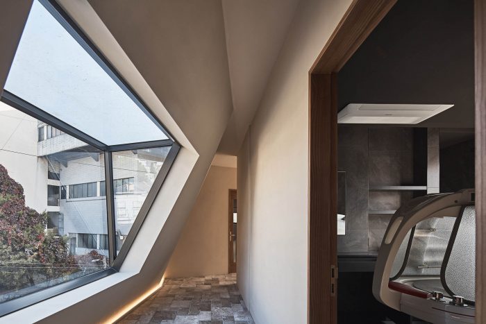 Areuke Spa is located on an alley in an old residential area at the heart of Hongdae. The site neighbours former residences modified into hair salons, restaurants, and cafes. In compliance with strict right-to-light laws resulting from the high density of houses, the building, shaped as a tilted pyramid, takes full advantage of the limited space granted within height restrictions.