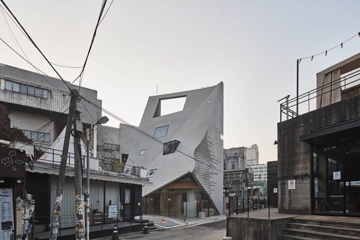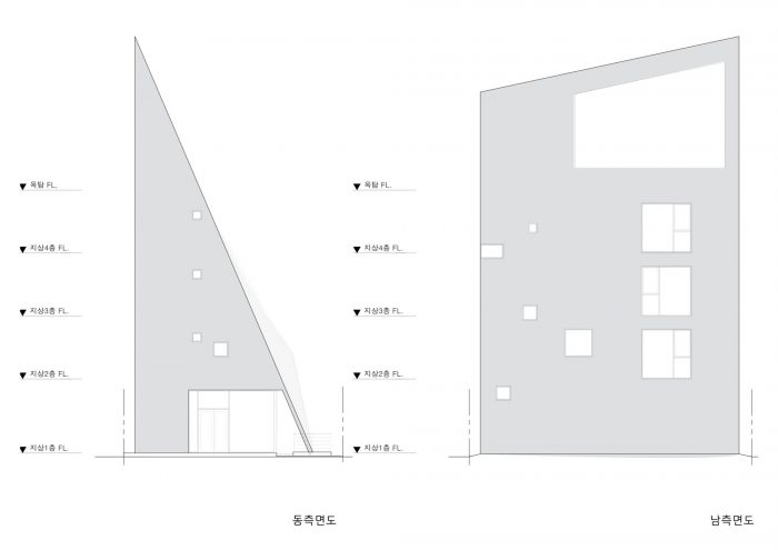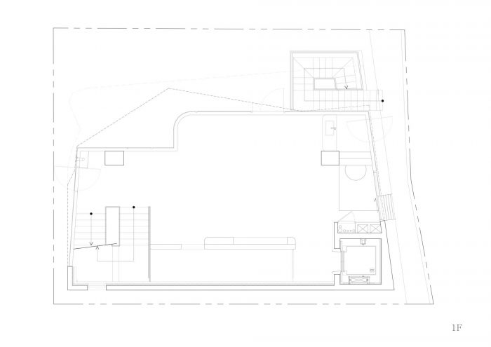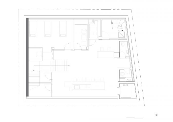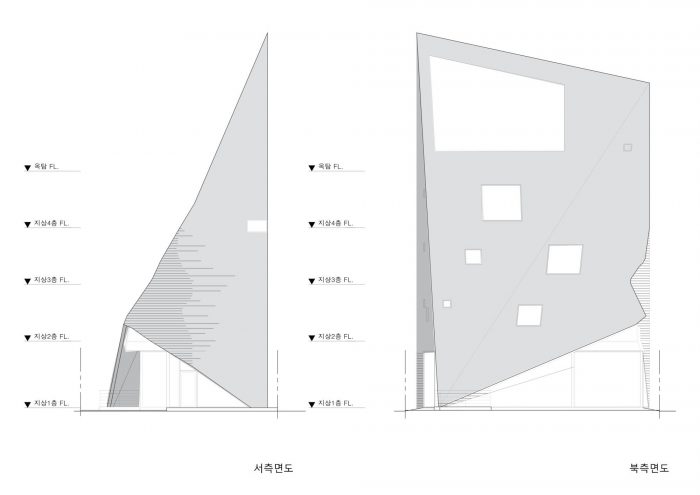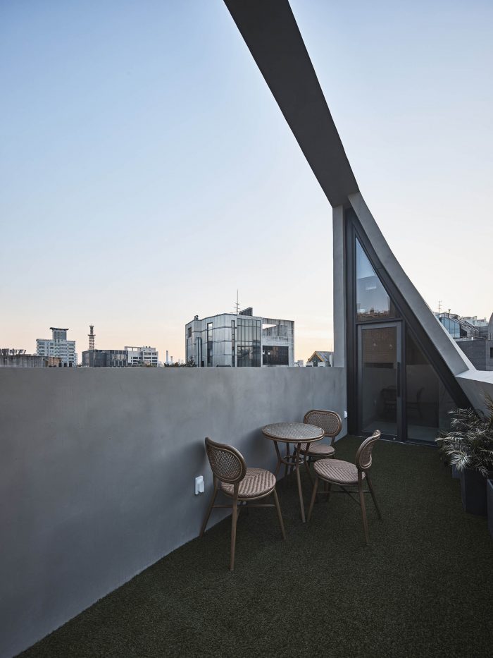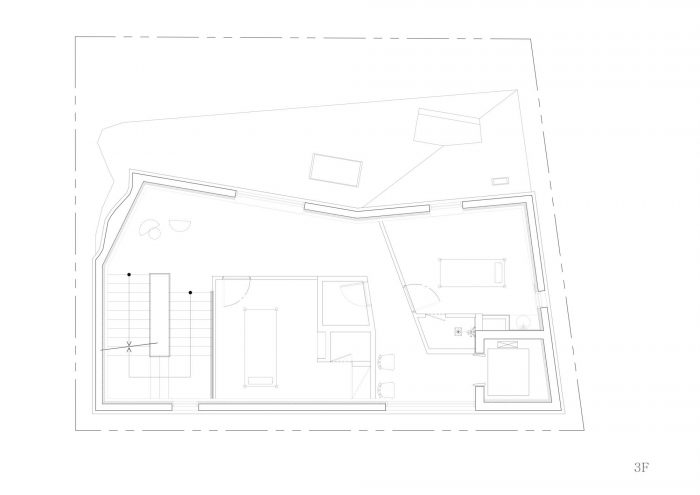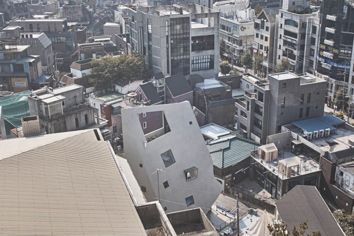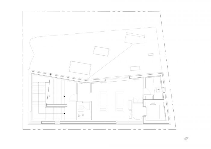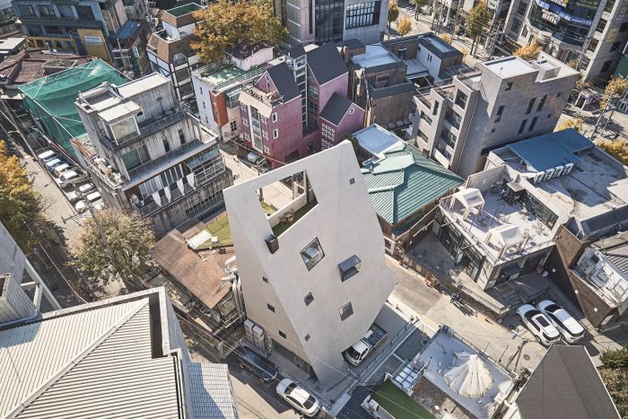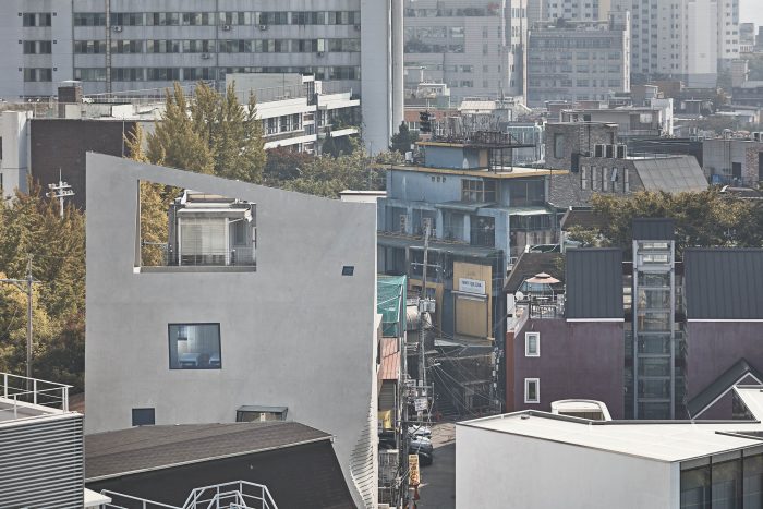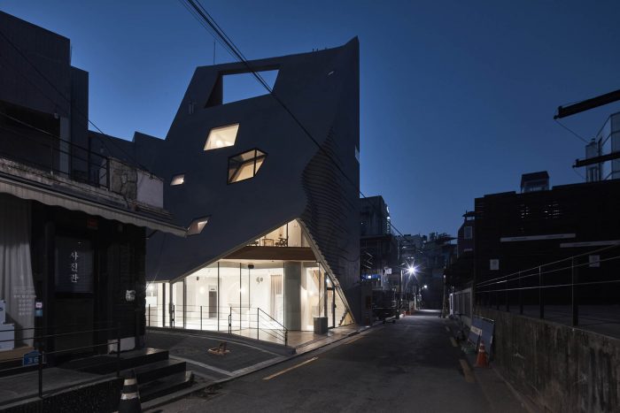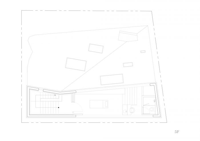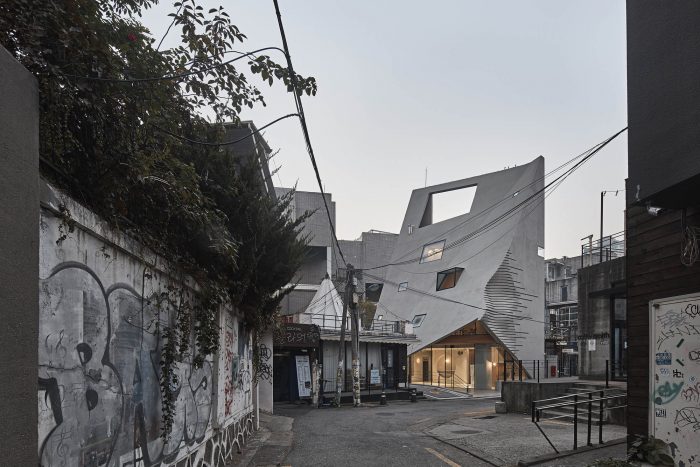 Areuke Spa is located on an alley in an old residential area at the heart of Hongdae. The site neighbours former residences modified into hair salons, restaurants, and cafes. In compliance with strict right-to-light laws resulting from the high density of houses, the building, shaped as a tilted pyramid, takes full advantage of the limited space granted within height restrictions.