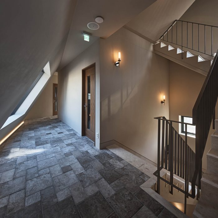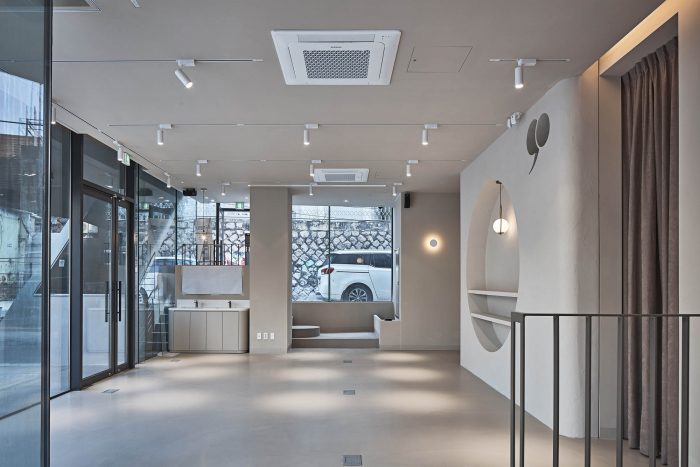 In contrast to the lower levels used for product exhibits and skin consults, the upper levels, which are for personalised spa care services, have smaller spaces. The basement level’s high ceiling makes it possible to host a wide variety of events and exhibits, with a hall that fulfills the functions of both cafe and spa. Overall, the levels were arranged in a vertical progression from public spaces at the bottom to private ones at the top.
