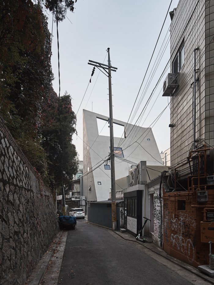 Areuke Spa位于弘大中心地带的一个旧住宅区的小巷里。这个地方与以前的住宅相邻,被改造成发廊、餐厅和咖啡馆。 为了遵守因房屋密度高而产生的严格的采光权法律,该建筑呈倾斜的金字塔状,充分利用了高度限制内的有限空间。