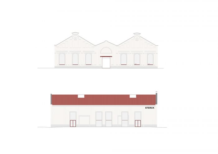 在仓库原来的正面,可以看到浮雕砖砌的大型矩形平面。在这些平面的节奏上,开口处用顶部圆形的混凝土框架进行了加固。一方面,所使用的混凝土与旧砖形成了很好的对比。另一方面,它也是一个支撑结构。新的外部细木工制品被放置在立面的后面,这样它就被新的混凝土结构所隐藏。侧面的立面也开了大窗--与停车场相邻--作为展示窗,将为建筑提供充足的日光。