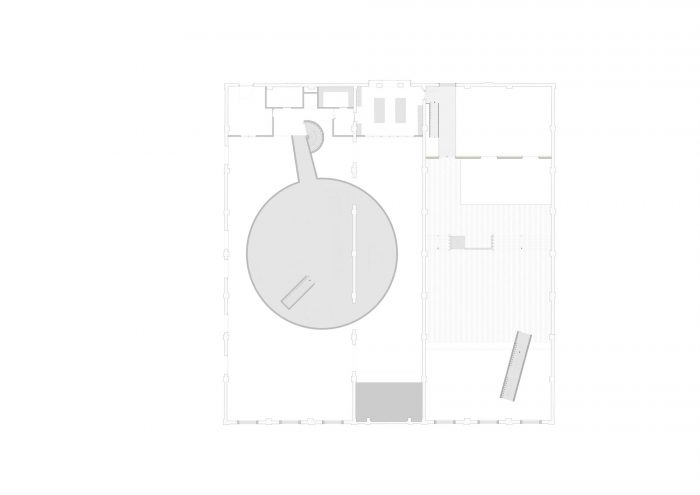 建筑物的规模要求进行重大的建筑运动,以使三个托架达到作为展示厅的规模。在这里,建筑的结构和家具的安排之间的关系必须仔细确定。因此,在设计内部时,选择使用三种原材料--混凝土、金属和木材--来填充开放的空间,同时由于它们的尺寸而对建筑进行细分。在整个建筑的左边和中间过道,放置了一个混凝土圆盘,放在三个建筑支架上。