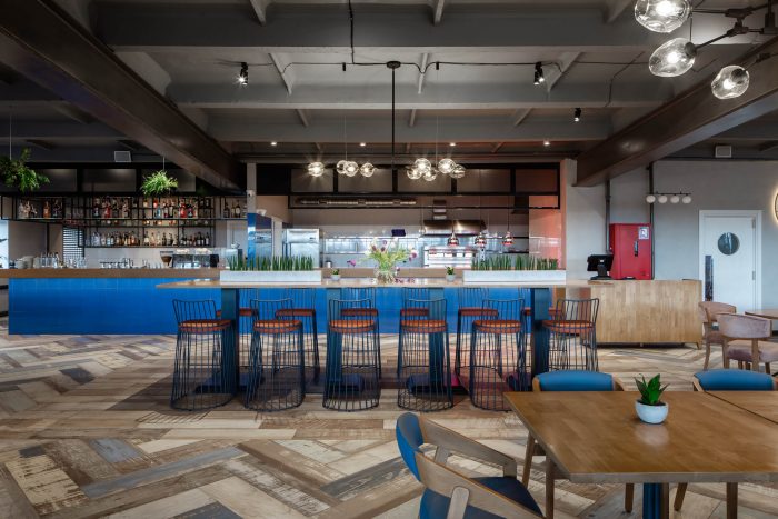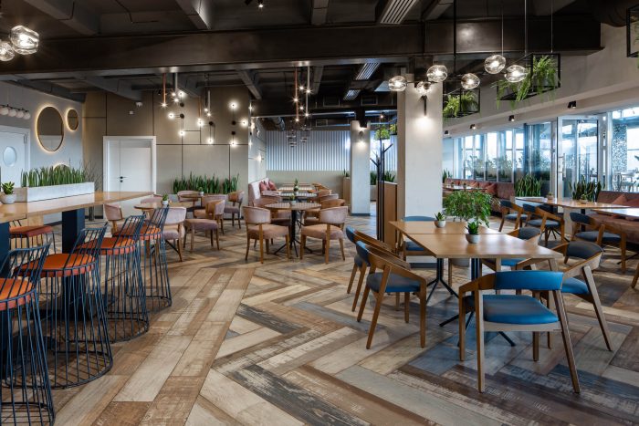 We had a goal to create a design for the large main hall of the restaurant, improve the terrace and solve the design of the entrance group. Number of seats in the main hall 65, on the terrace: 65. The total area of the institution is 600 m2. When creating this space, the existing structures such as metal beams, concrete slabs of the house were left. That thing was done to set the style of industrialism in the interior of that place. The concept of open space formed the basis of the planning scheme of tables and movement of visitors inside the restaurant. The materials that were used, while the space design was created, gave the visitors a comfort feeling and make it interesting for both adults and children. That's why we breed the gray colors of concrete and neutral color of wood with such bright accents, as chairs and accent colors of the bar and floor ceramics. Natural colors and textures were used in wall decoration.