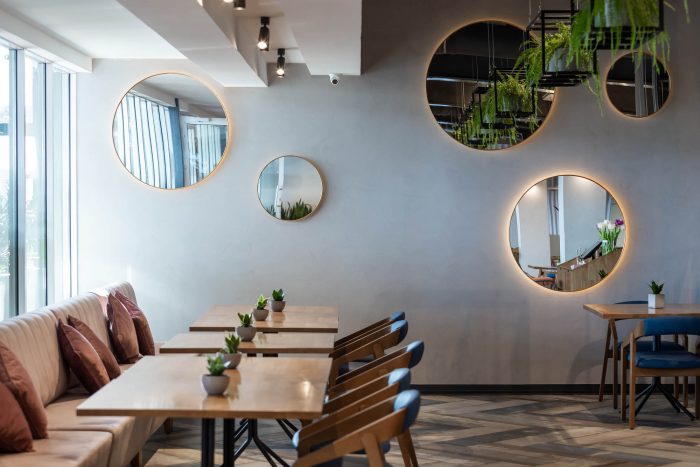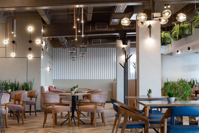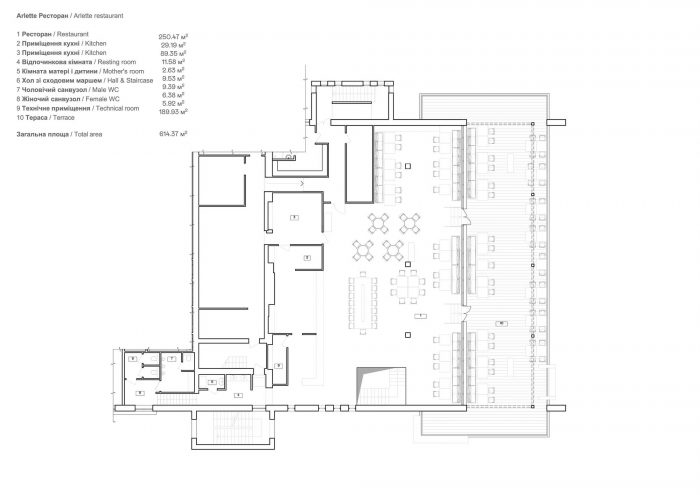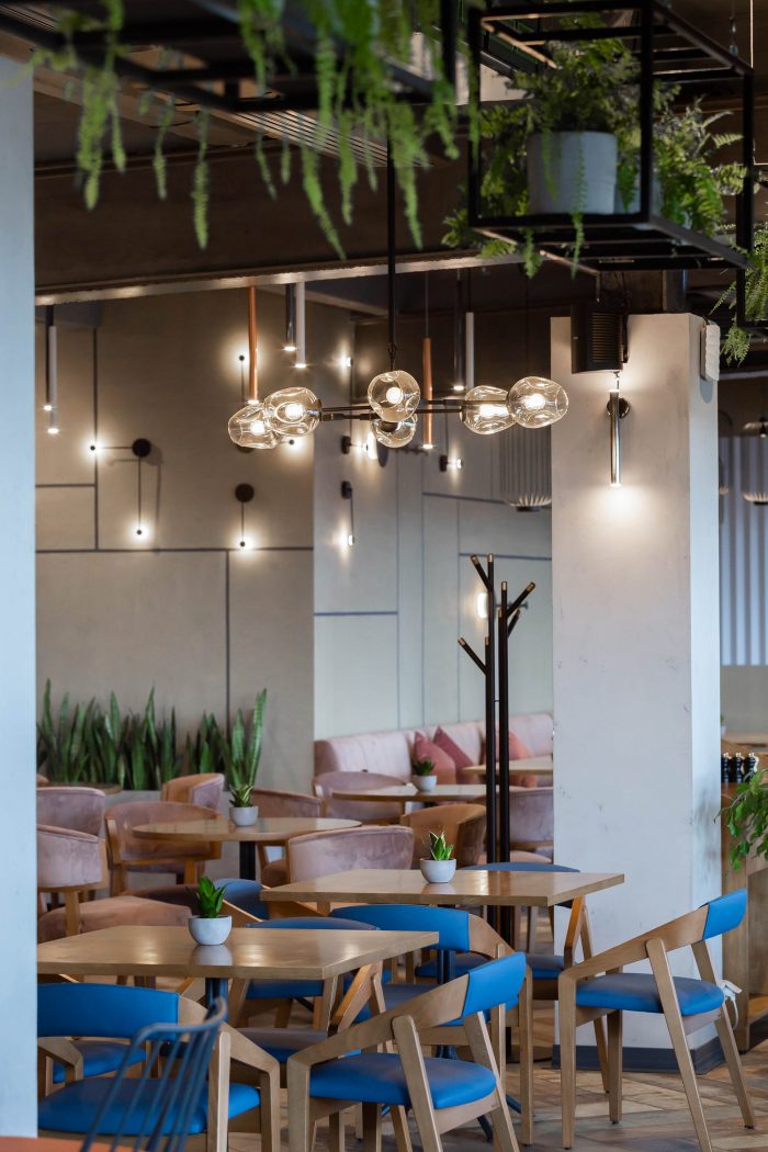 The restaurant is designed in the style of a city café in the building of the past cinema of Chervonograd city, built in 1970. Now this building is converted to the needs of the shopping center. The project was developed by the Lviv family bureau of architecture and design BARANBURO. The application of the concept of a city café made it possible to create a space that would attract city residents of all ages. The aim of this project was to create something new and unusual in the city, a kind of explosion that would initiate positive changes and trends in the design of the city. For such a small city as Chervonohrad, this is a new, interesting and trendy concept.