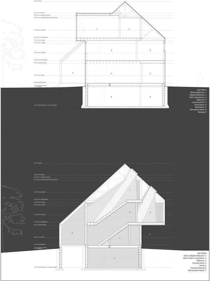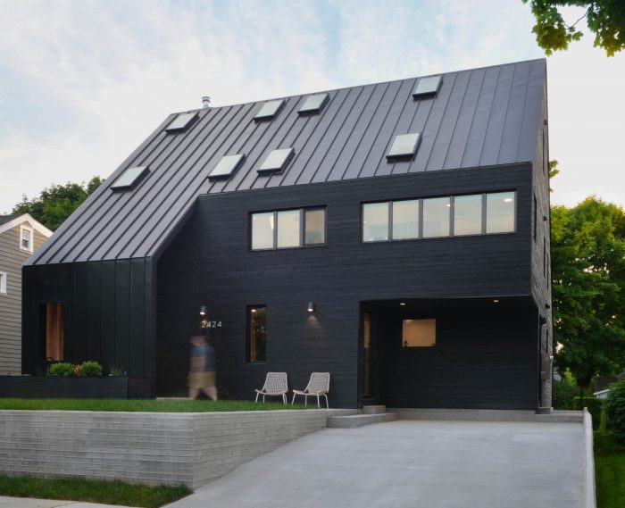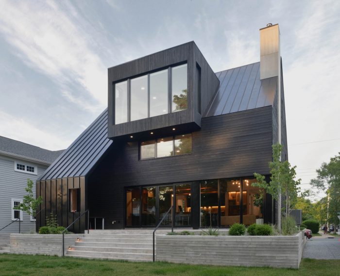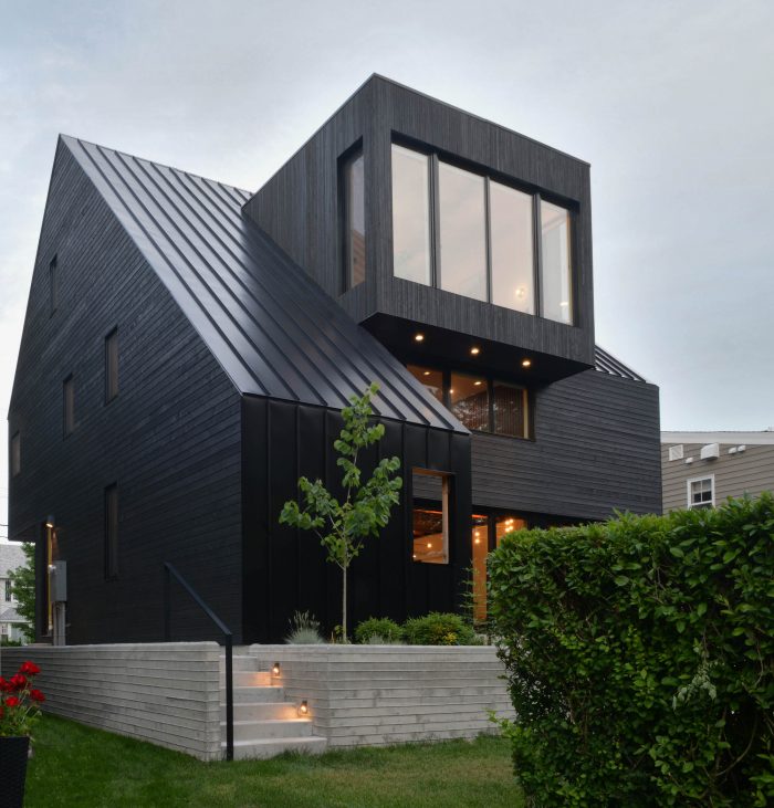The exterior massing and form aim to modernize traditional architectural forms found throughout Halifax’s historical neighbourhoods. The exterior material features a variety of textures within a minimal colour palette. Black reduces the building to its formal qualities, almost like a silhouette on a landscape. The surrounding custom board-formed concrete retaining walls provide an opportunity to consider dense urban residential landscaping as a complementary three-dimensional form to connect the interior and exterior.