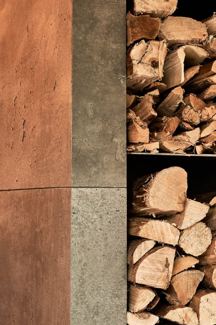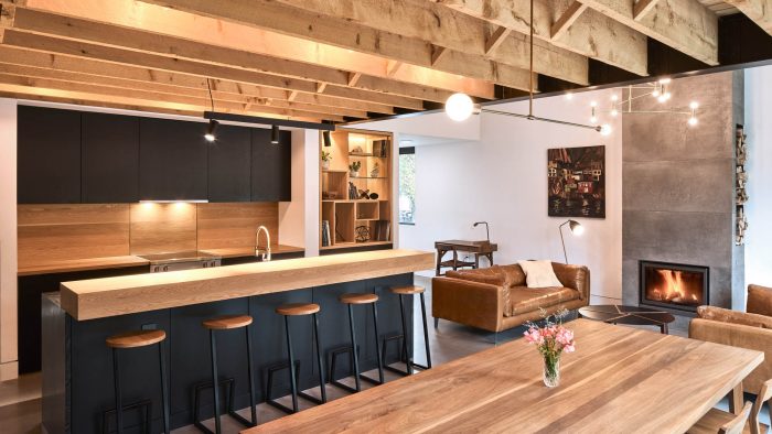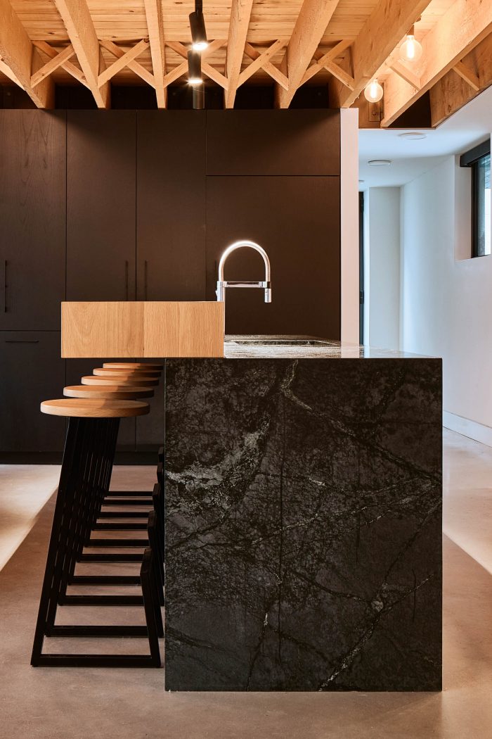 Like the exterior, the interior design of the Armcrescent Residence can be described as contemporary vernacular that places great value on craftsmanship. As both architect and builder, Peter Braithwaite Studio celebrates a diverse range of materials in a modern industrial style with extensive attention to detail and craft throughout the residence. Materiality is used to create contrast within every space. Feature elements such as a slatted teak screen or crossed-bridged rough-sawn hemlock rafters create a dynamic sweet and sour relationship.