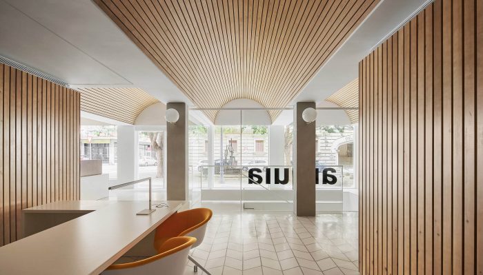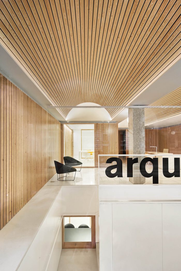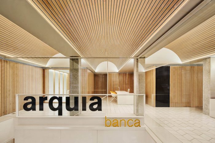 The commission is an integral renovation accommodating a reference office of the brand Arquia Banca in the city of Palma, Majorca. Located within a pre-existing corner building in residential use, it occupies ground floor and basement areas of comparable irregular geometry and square footage. Exposed front façade is long, has openings determined by structural components and interacts with broad tree-lined pavement functioning as a plaza.