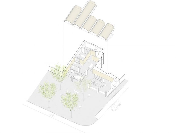 The spatial arrangement takes advantage of the L-shape of the property and is determined by transitioning from public spaces, located towards the front, to private ones, further away both in plan and section. Finally, confidential and storage facilities are situated at the back against the enclosing wall.