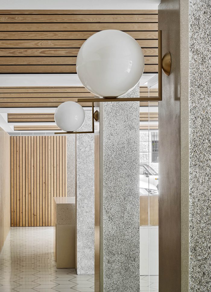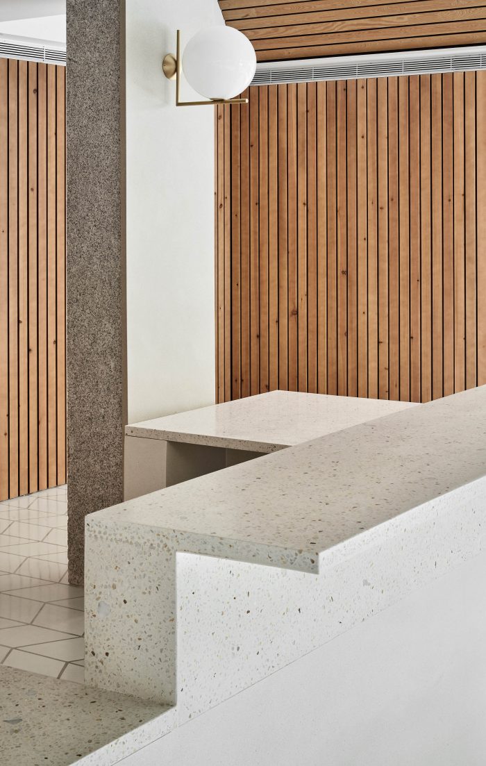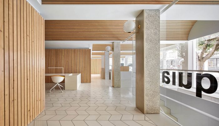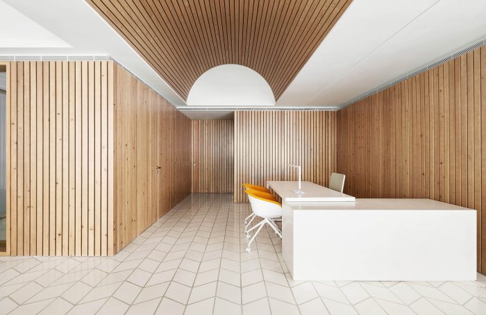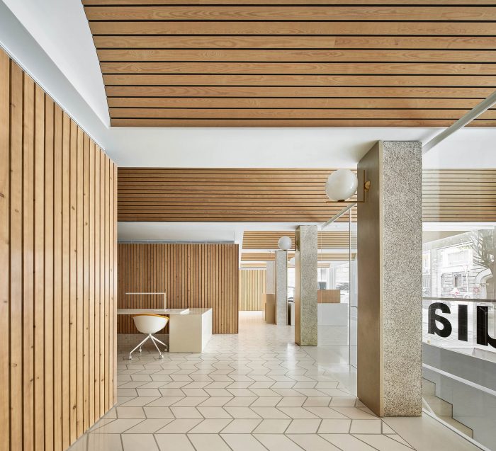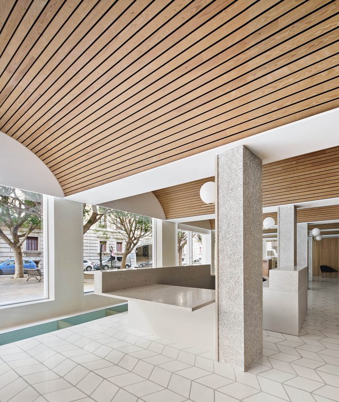 A modest number of materials has been used, all sourced locally. The materiality of the project supplements the spatial proposal. A sequence of pine vaults covers the areas of interaction with the clients. This new ceiling smoothly incorporates the pre-existing pillar grid and aims to create a warm, welcoming atmosphere accompanying the banking experience. Vertical walls employ the use of pine timber as well, in addition to lacquered MDF boards. Lastly, the floor finishes are polished hydraulic tiles and cement, for the areas occupied by clients and remaining ones respectively.