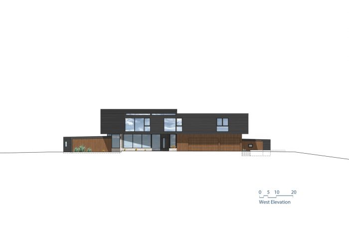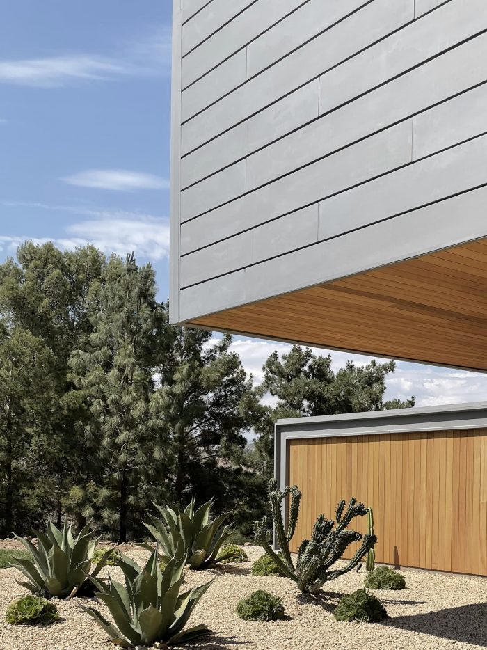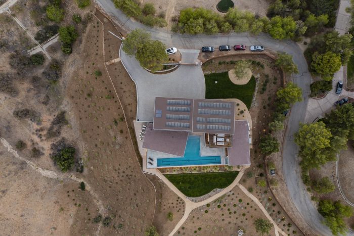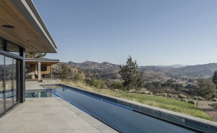 The pool terrace and adjacent open-air living room unfold onto the meadow and ultimately the arroyo below, augmenting a natural, preexisting path for animals with a minimally delineated walking loop with which to explore the site. The sensitive nature of the fire susceptible landscape, as well as the unique climate, solar, and seasonal conditions called for careful positioning of the home, as well as consideration of plant specifications and irrigation requirements.