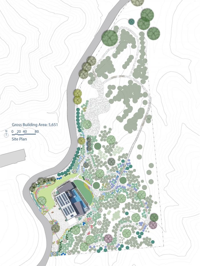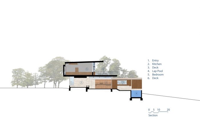 泳池露台和相邻的露天起居室延伸到草地上,并最终延伸到下面的河谷,为动物提供了一条自然的、预先存在的路径,并为探索该地提供了一个最小的步行圈。易受火灾影响的景观的敏感性质,以及独特的气候、太阳和季节条件,要求对住宅进行仔细定位,并考虑植物的规格和灌溉要求。