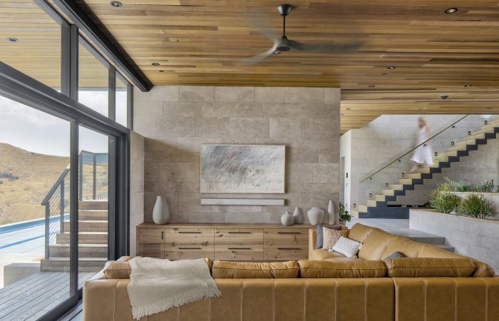 The lower level, containing a home gym, laundry room, guest suite, and pool terrace, extends into the hillside providing an unobstructed panoramic vista. The continuous materiality of cedar and limestone accentuates the experiential relationship between inside and out. This connection to the outdoors continues on the upper level, which contains the primary bedroom, home office, two secondary bedrooms, linear balcony, and lounge deck.
