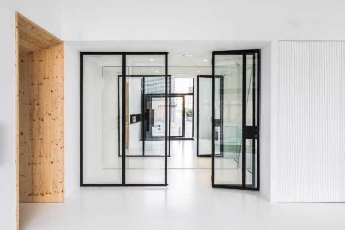 Taking into account the company has a strong committment with the training of its employees and representatives the headquarters were in need of a training area. The ground floor with access from the street is distributed between two scopes, the hall and these formation area. The divisions between the spaces are conceived as containing walls of habitable furniture, harboring the necessary program and installations.