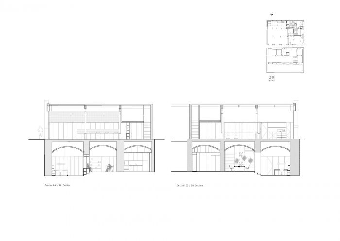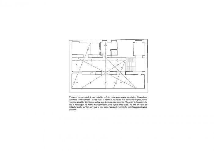This basement floor is thought from the idea of having again the original visual connections across a great central space with a large table. where habitually the main business activity resides as well as intersections and interactions of the daily company routine. The other two vaults are distributed parallel, and from every point of view, makes it possible to recognize the entire basement in its whole dimension.