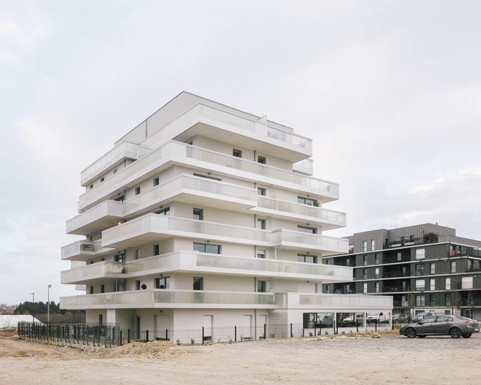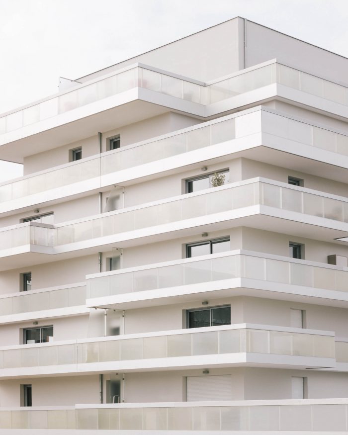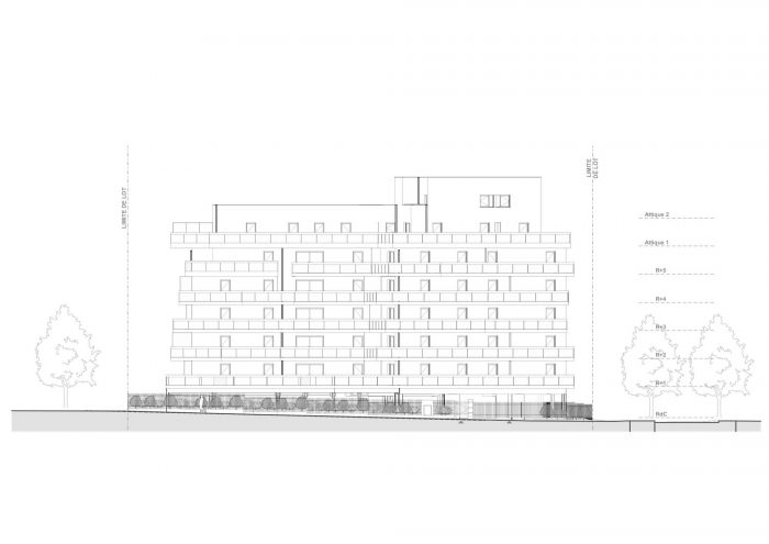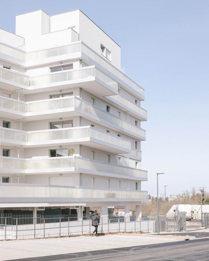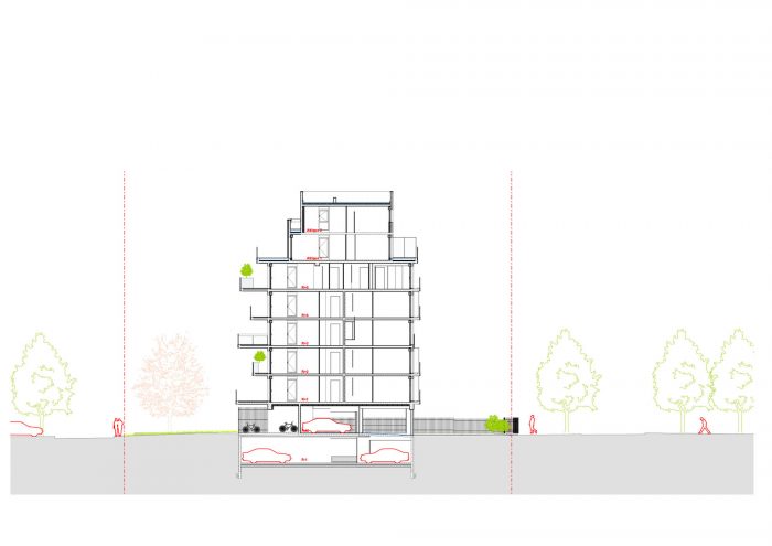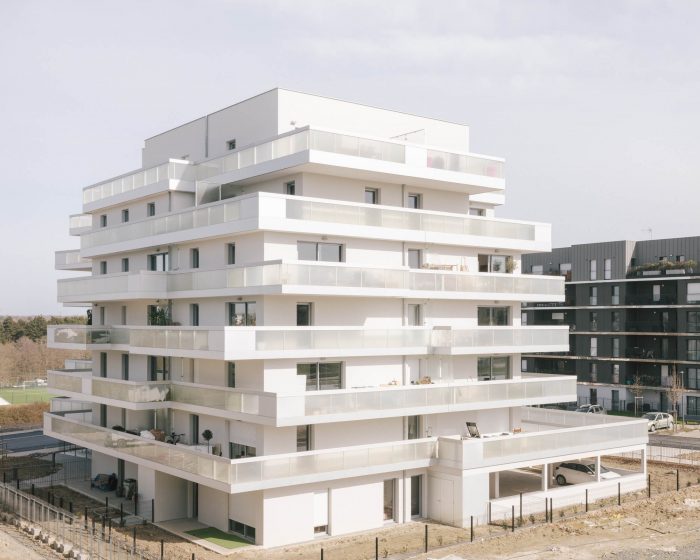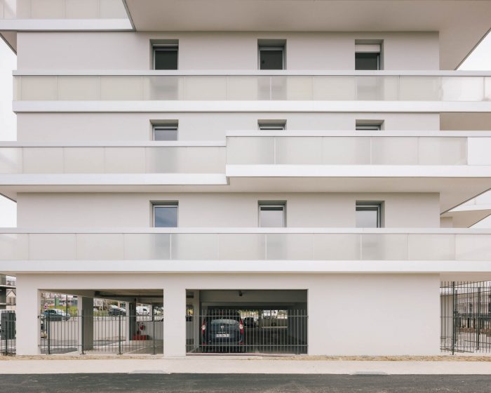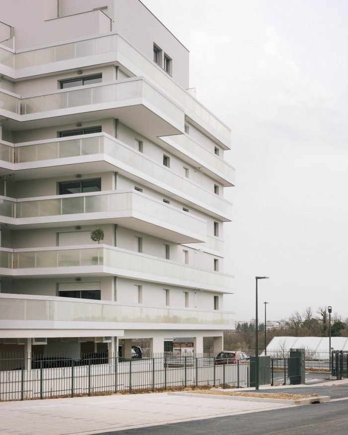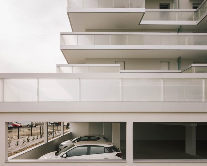 The treatment of the facades is homogeneous according to the orientation and the different levels, without a hierarchy of orientation. The masonry parts are painted concrete of light color. The eastern part of the ground floor houses parking spaces. These spaces are covered by a vegetated concrete roof treated in the continuity of the terraces. The single-car access is located to the east of the lot. It serves as the access ramp to the basement (22 spaces) and 24 parking spaces located under the building on the ground floor.