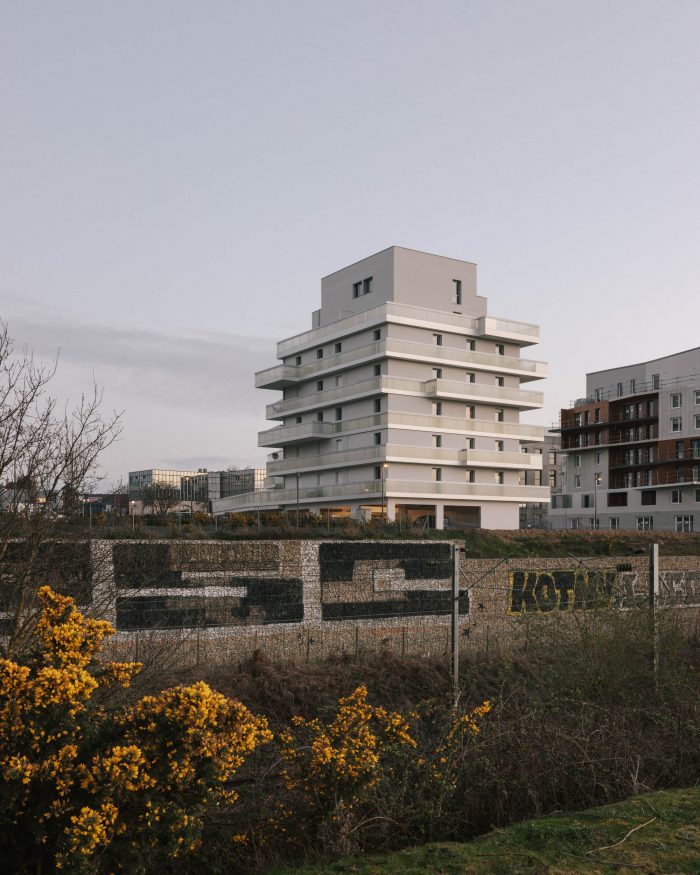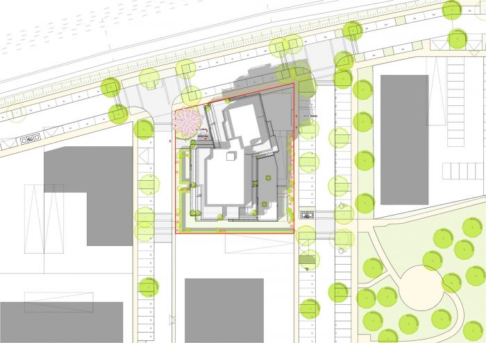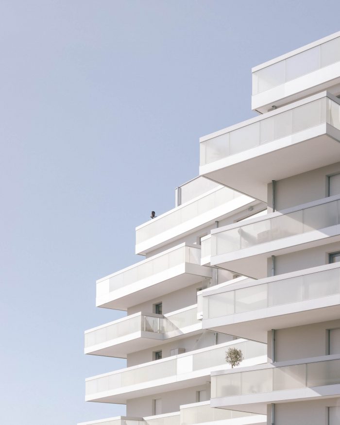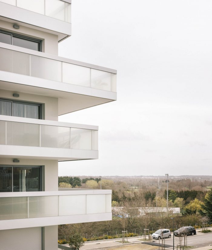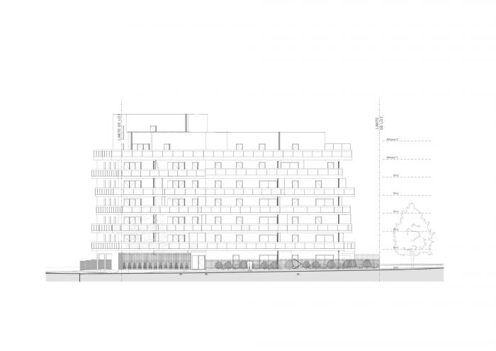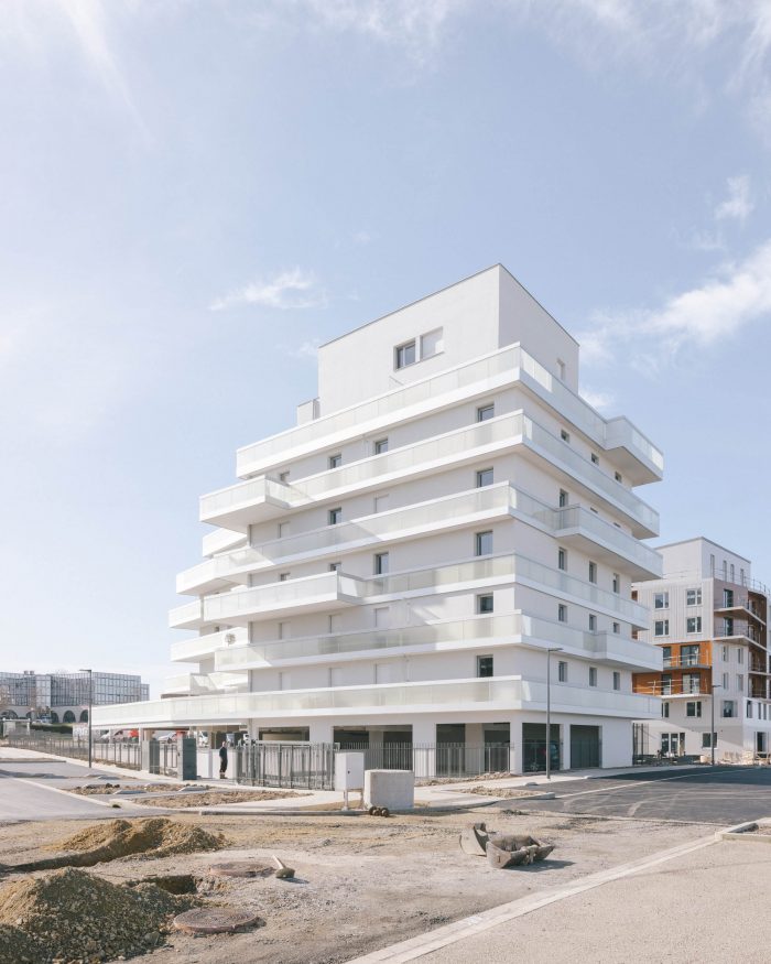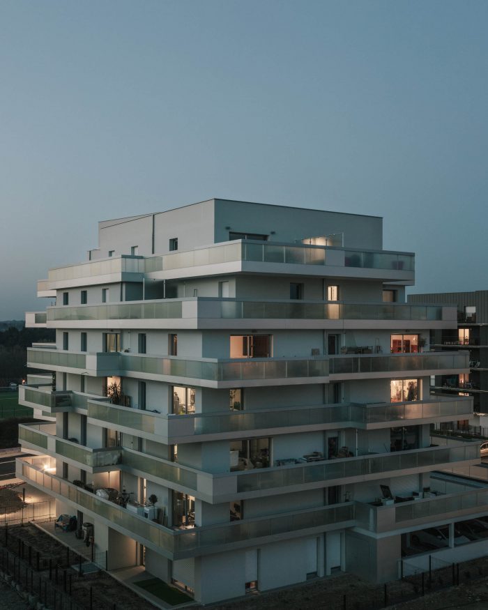 The treatment of the facades is homogeneous according to the orientation and the different levels, without a hierarchy of orientation. The masonry parts are painted concrete of light color. The eastern part of the ground floor houses parking spaces. These spaces are covered by a vegetated concrete roof treated in the continuity of the terraces. The single-car access is located to the east of the lot. It serves as the access ramp to the basement (22 spaces) and 24 parking spaces located under the building on the ground floor.