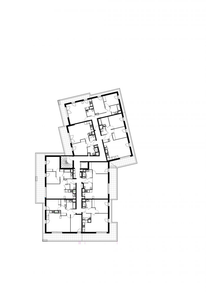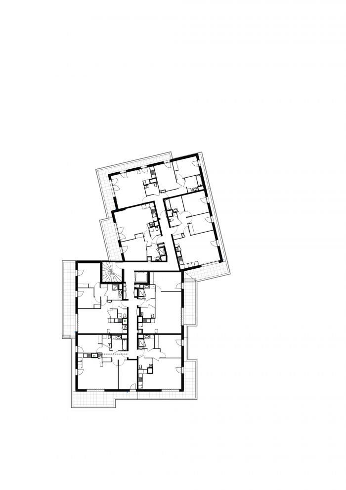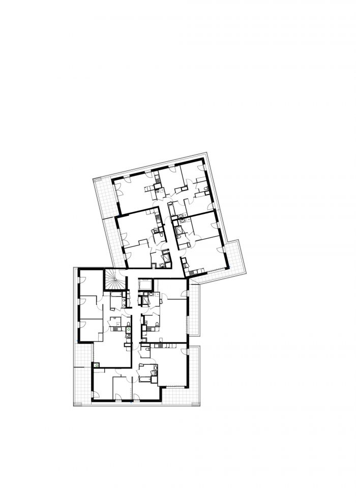通往各单元的主要人行通道位于该地段的西北角。一个被处理成铺装广场的公共空间为宽敞的玻璃入口大厅和两轮车房提供服务,该房间被锁在与所有街区共同的围栏相连接的后面。