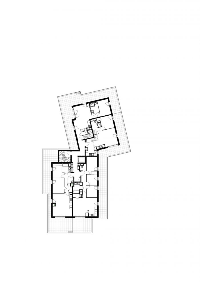 The last levels in the attic are set back from the façade. They express the relationship to the sky by the fragmentation of the built volume.