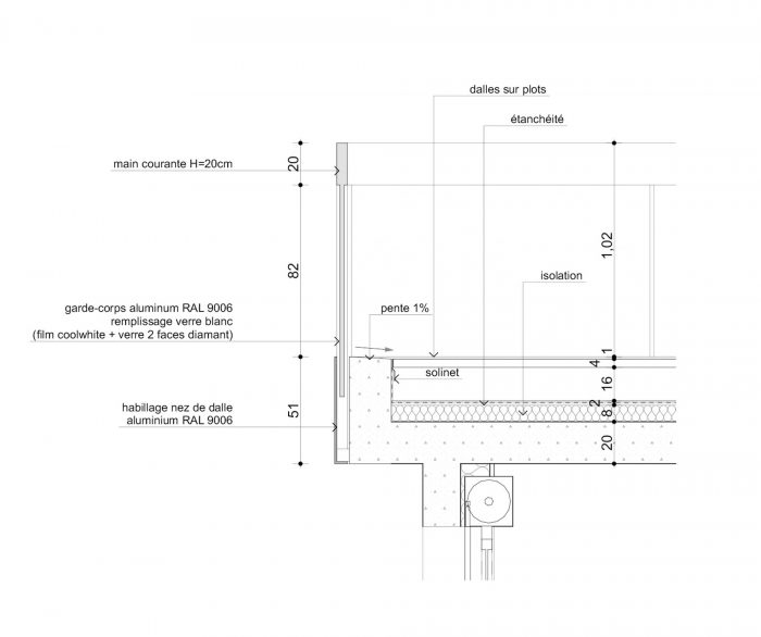 建筑物的主体并没有因为热性能的原因而在楼层上有所变化。从一层到另一层变化的是露台:有时宽,有时深,它们 "模糊 "了建筑的界限。栏杆是用漂白的玻璃填充的。石板围栏和阳极氧化铝扶手具有独特的厚度,有助于抹去当前楼层的规模。