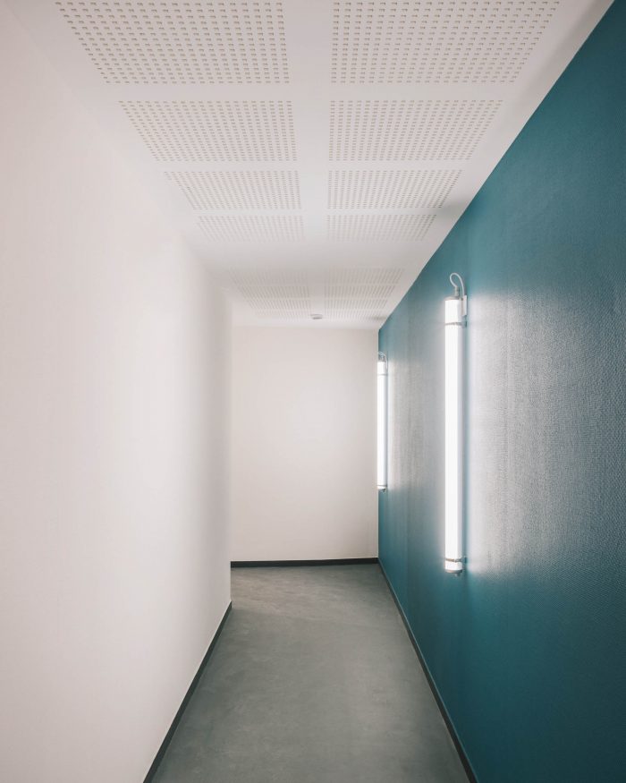 外墙的处理根据不同的方向和不同的层次是同质的,没有方向的层次性。砖石部分是浅色的混凝土漆。地面层的东部是停车位。这些空间被一个植被混凝土屋顶所覆盖,并在露台的连续性上进行处理。单车通道位于该地段的东部。它是通往地下室(22个车位)和位于底层建筑下的24个停车位的坡道。