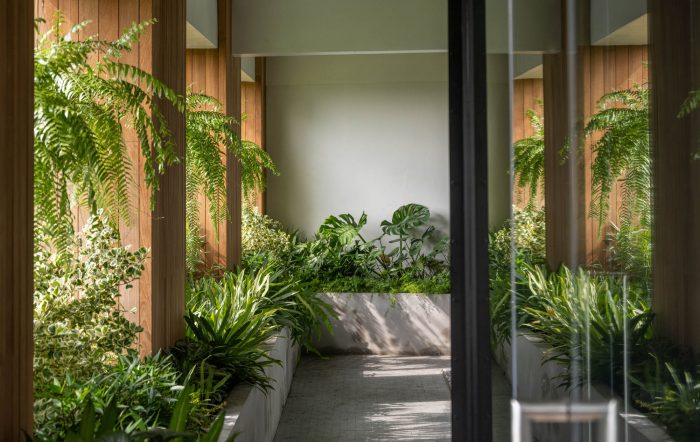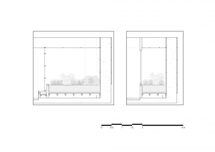 因此,我必须自己建造我想要的东西。根据赖特的概念,我决定在建筑的北面和东面减少15%的面积,以创造由鹅卵石地板、混凝土花盆、木地板和少量碎石组成的树木-阳台。这些元素塑造了室内自然景观,也为室外建筑和电线景观提供了缓冲。人们可以走来走去,发现自己就像走在底层一样。