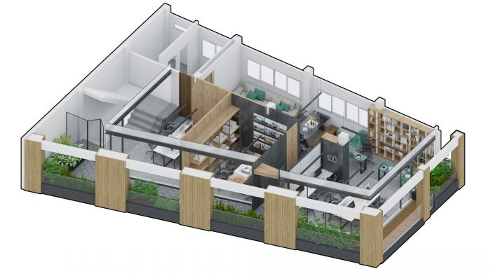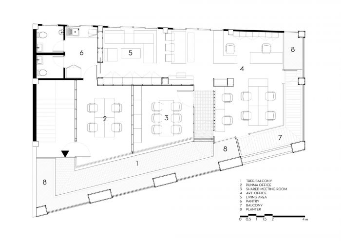 平面图上有4个分区,分别是ARTi建筑师办公室、共享会议室、灯光设计/平面设计租赁室和树木阳台,可以通过每个分区进入。我相信,良好的环境可以塑造良好的精神状态,也可以给设计师带来良好的灵感。我希望看到这样的办公室,人们愿意在一天中平衡地工作和休息,并以我把自然带到三楼的概念来打动访客。"如果你真正热爱自然,你会发现到处都是美"。--文森特-梵高