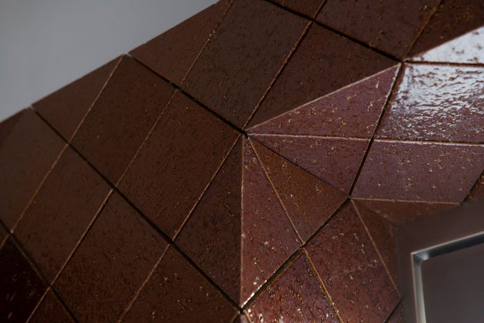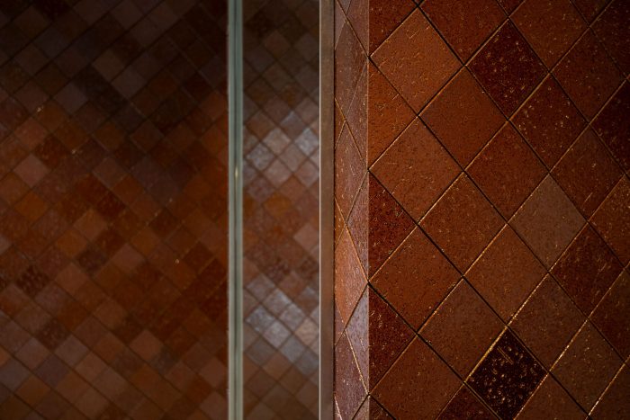 大濠公园是一个多年来为福冈人民所熟悉的城市公园,因此,我们认为创造一个将客户的生产和商店设计理念与这个环境的意义相交融的空间是合适的。我们选择的主题是装饰在福冈市美术馆外墙的红棕色瓷砖,该美术馆位于公园内,多年来也一直受到公众的喜爱。已故建筑师前川邦夫所使用的瓷砖具有像陶器一样美丽的质地和光亮的釉面,我们觉得它们是一种象征这个地区的总体材料。我们觉得瓷砖的工艺之美与艺术与科学的概念相一致。