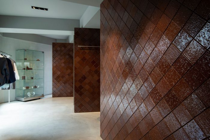 此外,在主立面的一侧特意建造了一道隔断墙,让顾客在轻松的环境中挑选商品,这面墙也用同样的瓷砖来装饰,从街上看是一个展示窗口,从室内看是一个凹陷的货架。瓷砖不仅被用作墙面装饰,还被用作固定装置和小型展示工具的材料,以115毫米的正方形为模块,定义墙面和展示部件的所有尺寸,创造出多样化和精致的表达。