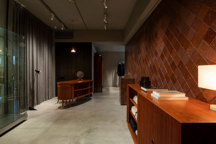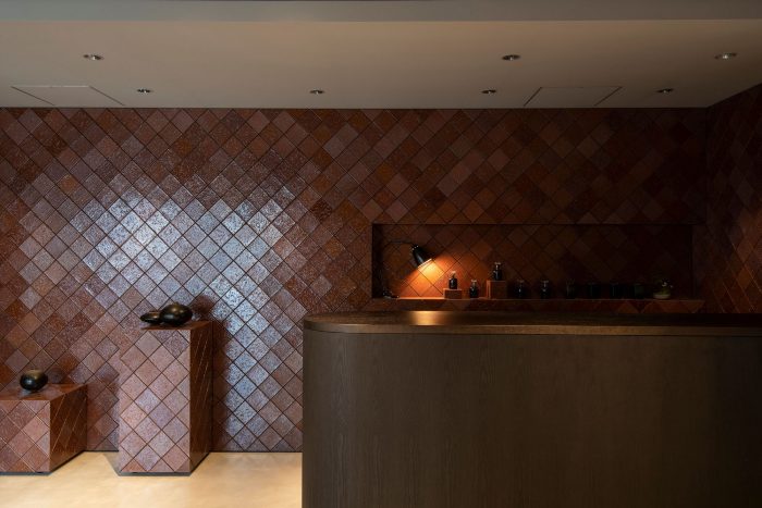 Ohori Park is a city park that has been familiar to the people of Fukuoka for many years, thus we felt that it would be appropriate to create a space that intersects the client's philosophy of manufacturing and store design with significance of this environment. The motif we selected was the reddish-brown tiles that decorate the exterior walls of the Fukuoka City Art Museum, which is located in the park and has also been loved by the public for many years. The tiles used by the late architect Kunio Maekawa had a beautiful texture and glossy glaze as pottery, and we felt that they were a material that symbolized this area in general. We felt that the craft-like beauty of the tiles was compatible with the concept of Arts & Science.