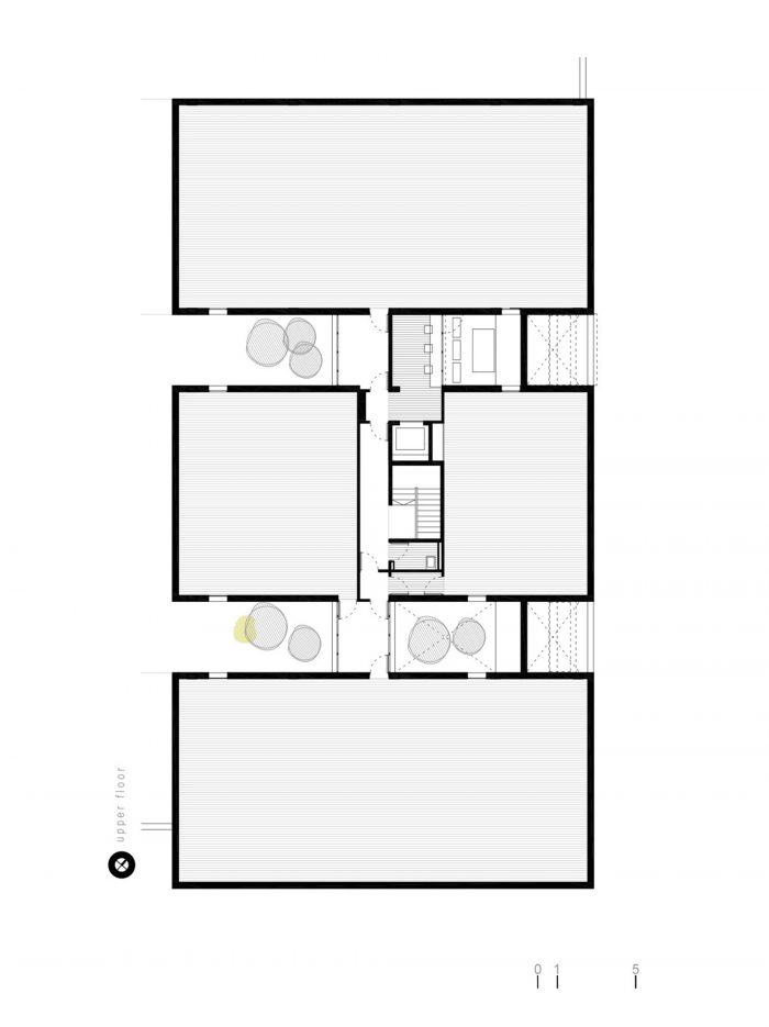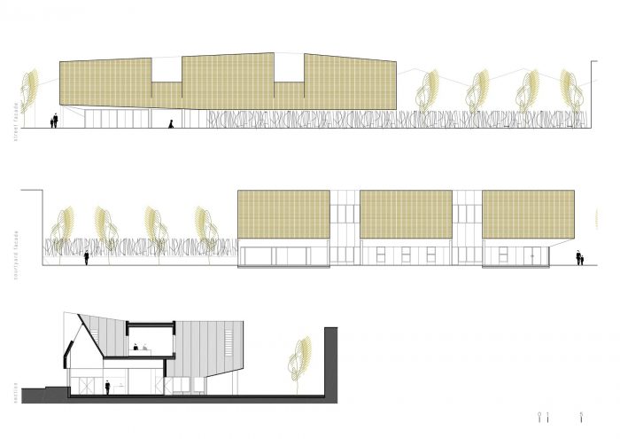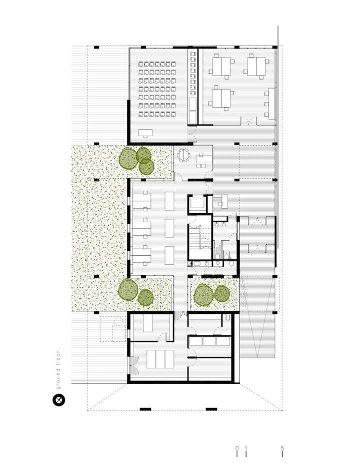 The work areas downstairs (lecture hall, conference hall, classification area and reception area) have direct access to the courtyard of the plot, which can be understood as an extension of interior spaces.