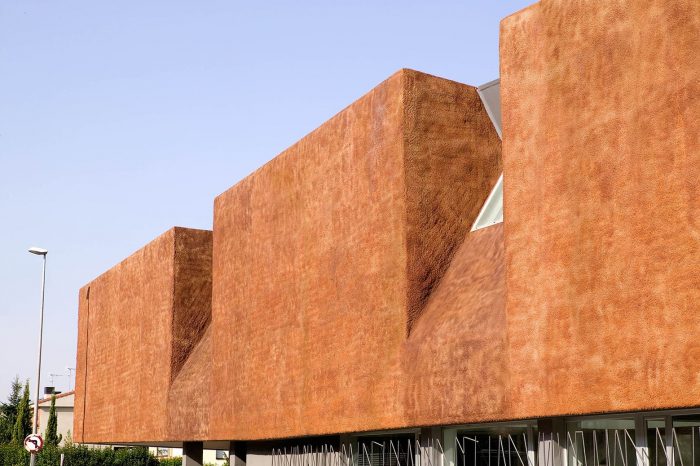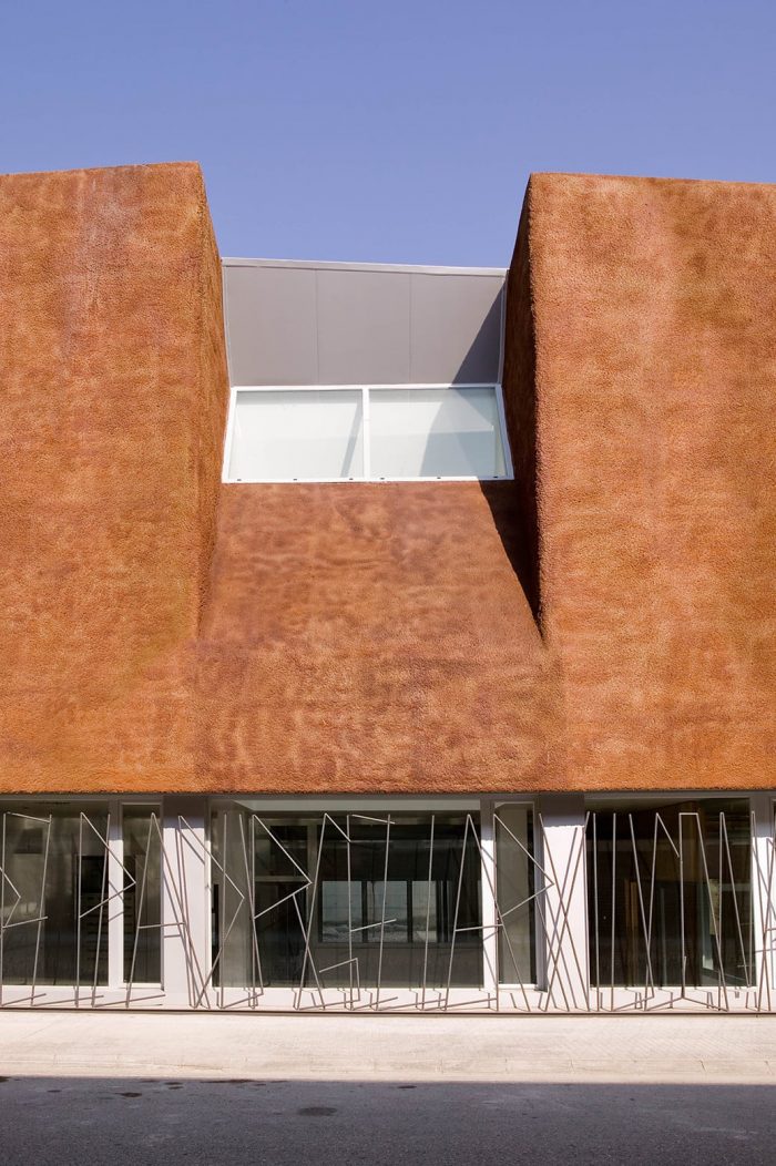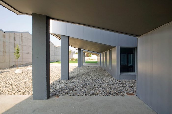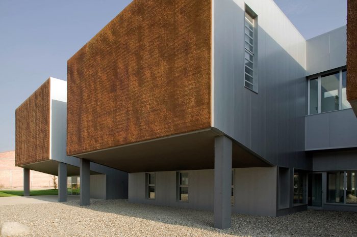 该建筑被认为是一个巨大的石化和不透明的体量,置于一个透明和可渗透的主体之上。体积似乎是可塑的,可以适应建筑的布局;它升起来标志着入口,并在后院形成一个门廊,以保护工作区的阳光。两个天井将体量切成三部分,使建筑中最黑暗的区域有自然采光和通风。
