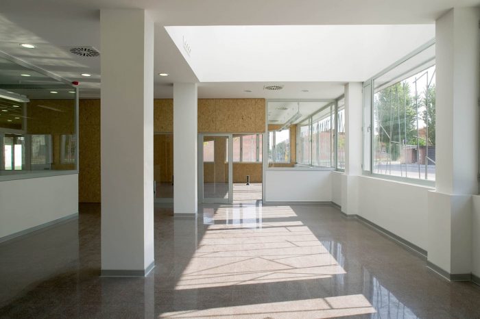 The building is divided into two floors. The ground floor is located one meter below the street level and it is accessed via a ramp down, thus accentuating the feeling of weight in the volume of the first floor. This floor containes the public area and the office zone, while the archives warehouses are placed in the upper floor. This layout makes a very compact and optimized building.