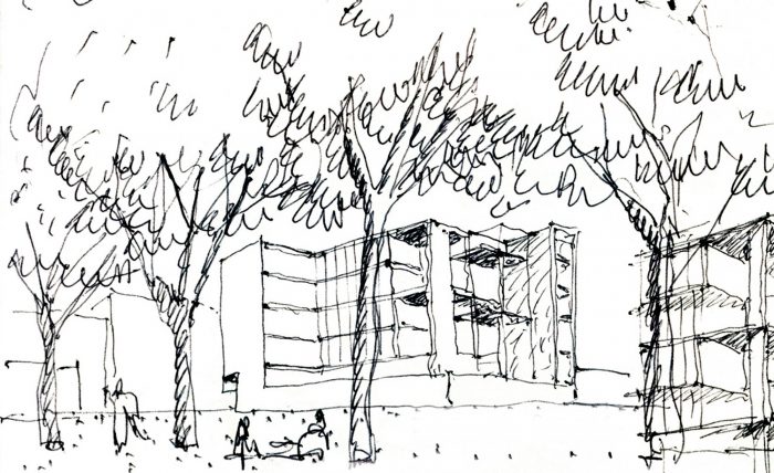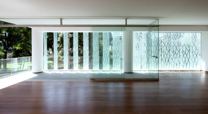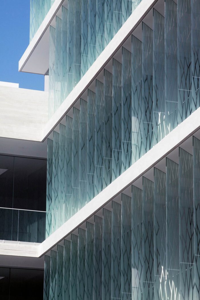 The façade facing the passage from the street to the park is equipped with parasols of printed glass which protect the apartments from the western sun and views from neighboring buildings without losing light or views toward the park. At the same time, the parasols permit a certain liberty in the distribution of the apartments and terraces without disturbing the continuous image of the façade.