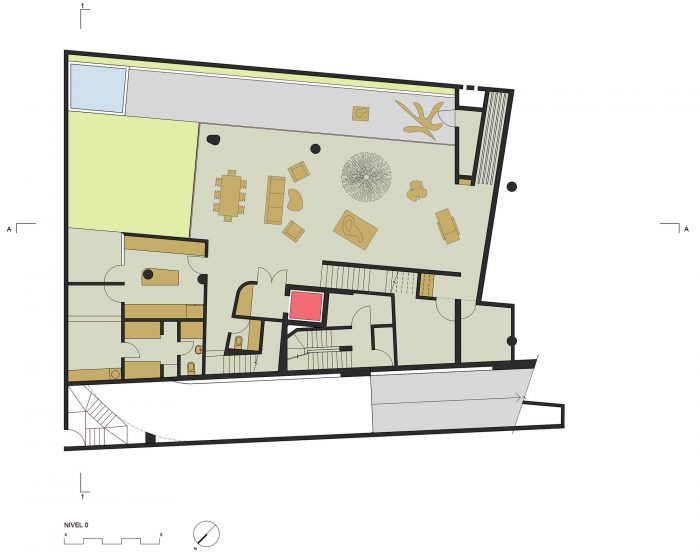 然而,城市参数禁止使用屋顶区域,因此该项目具有 "公园里的房子 "的特征,相对于街道来说是半埋在地下的,这样就能获得上面的4套公寓。