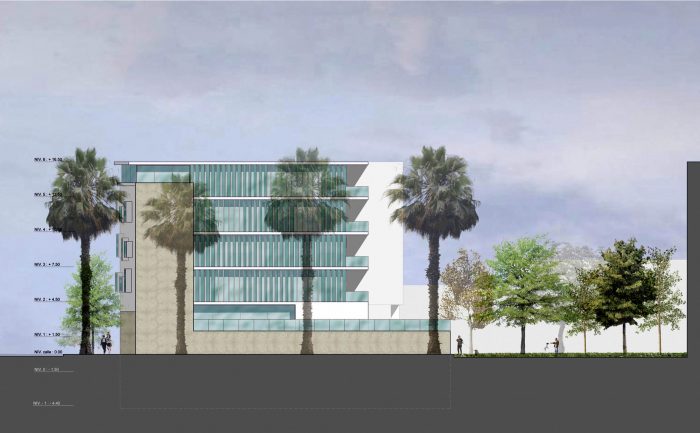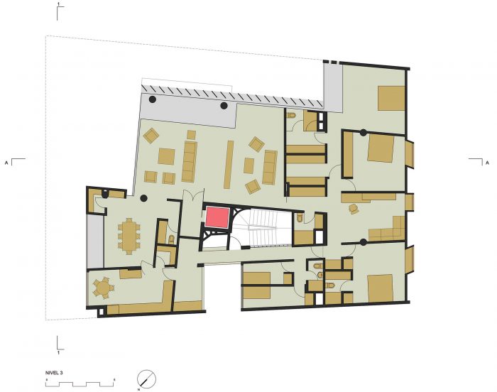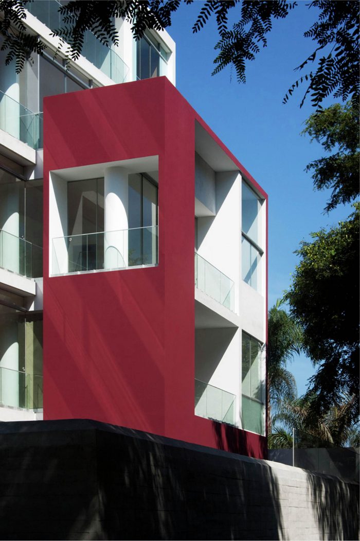 The apartments, each occupying a single level, concentrate the bedrooms along the street enclosed by protective walls with specific punctures for windows, while the social zone opens to the landscape of the park.