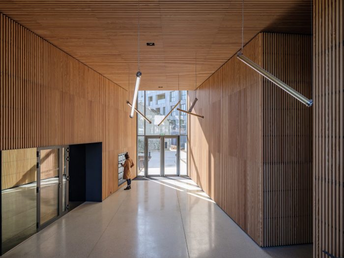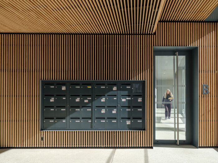 The project uses a variety of approaches to ensure sustainability and social responsibility. Densifying an urban area reduces the city’s need to expand into the surrounding landscape, and the parking garages include a total of 210 square meters for bicycle parking, including dedicated spaces for cargo bicycles and electric charging stations to encourage more sustainable transport options. The 34 apartments in the smaller building are completed to Passivhaus standards, giving them the potential to use dramatically less energy than typical apartments. Many of the apartments are double or even triple aspect, with windows on multiple sides of the building to allow cross ventilation and excellent natural light conditions inside.