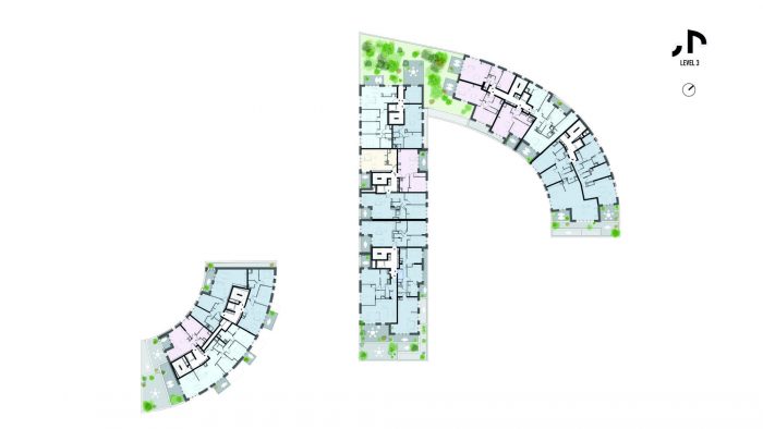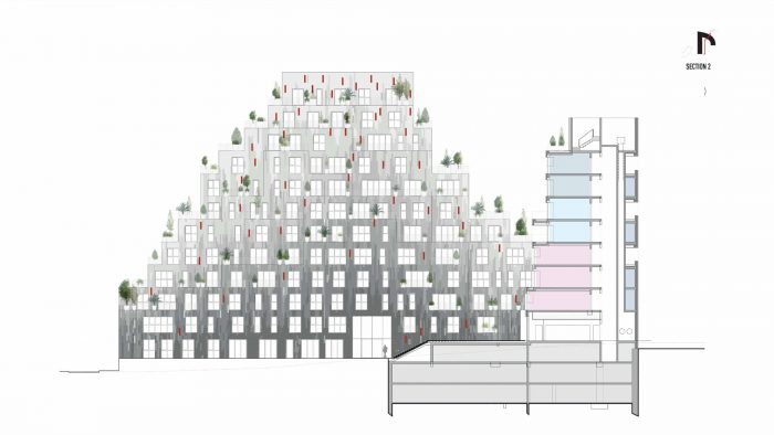Ascension Paysagère从地质构造中获得灵感。该项目包括两个弯曲的建筑,一大一小,坡度逐渐后退。在河边,以及在项目接近其邻居的地方,建筑很低,承认了广阔的低层环境。然而,在其他地方,设计逐渐上升为三座山峰,在场地中心达到最大的12层楼高度。这些逐渐后退的露台上摆放着装满绿色植物的花盆,将河岸的郁郁葱葱的气氛向上延伸到公寓,甚至是在建筑的最顶端。在较大的街区的西角,在建筑的两个 "山峰 "之间,一个包括果树的花园强调了这种绿色的方法。