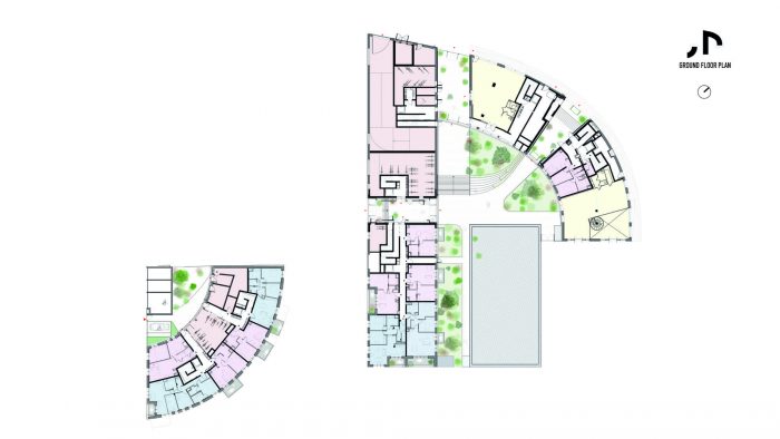 该项目采用了多种方法来确保可持续性和社会责任。使城市区域密集化减少了城市对周围景观的扩张,停车场包括总共210平方米的自行车停车场,包括货运自行车和电动充电站的专用空间,以鼓励更多的可持续交通选择。小楼里的34套公寓是按照Passivhaus标准完成的,使它们有可能比一般的公寓大大减少能源的使用。许多公寓都是双面甚至三面的,在建筑的多个侧面都有窗户,以允许交叉通风和内部良好的自然光条件。