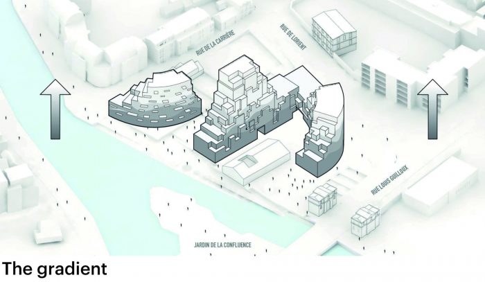 2018年,法国杂志《l'Express》称雷恩为法国最宜居的城市,再加上2017年新的TGV连接的到来,这种吸引力导致了人口的持续增长。市中心的许多遗产建筑将这种扩张压力向外转移,要求周边地区要么向外延伸到农村,要么--最好是--向上发展,采取令人愉快的密集化方式。Ascension Paysagère位于Ille河与Vilaine河的交汇处,在Jardin de la Confluence的绿色浮动公园对面,在Mail François Mitterrand现在的步行街的尽头,Ascension Paysagère的高度可见位置要求对这种周边密集化采取一种示范性的方法。